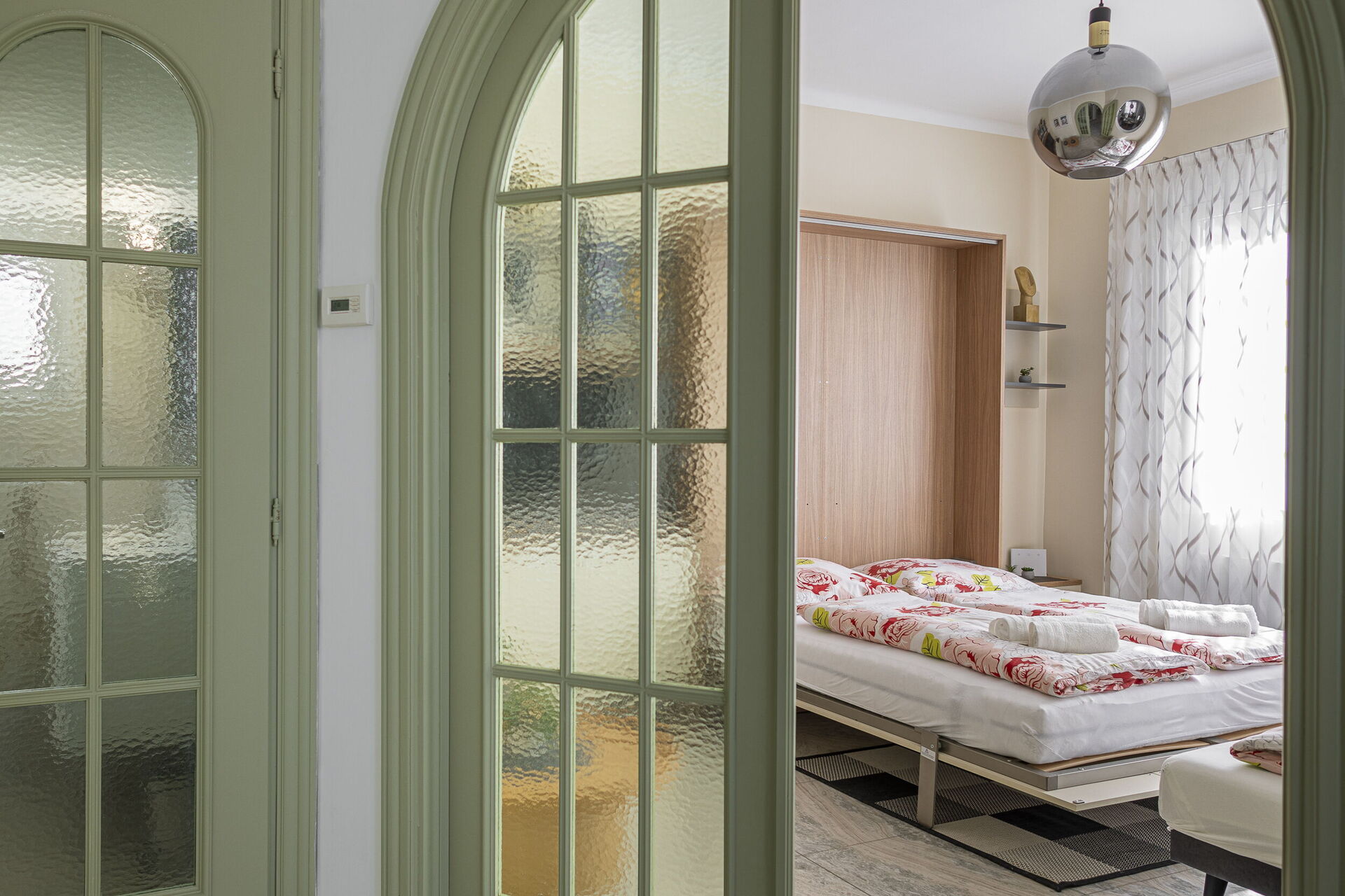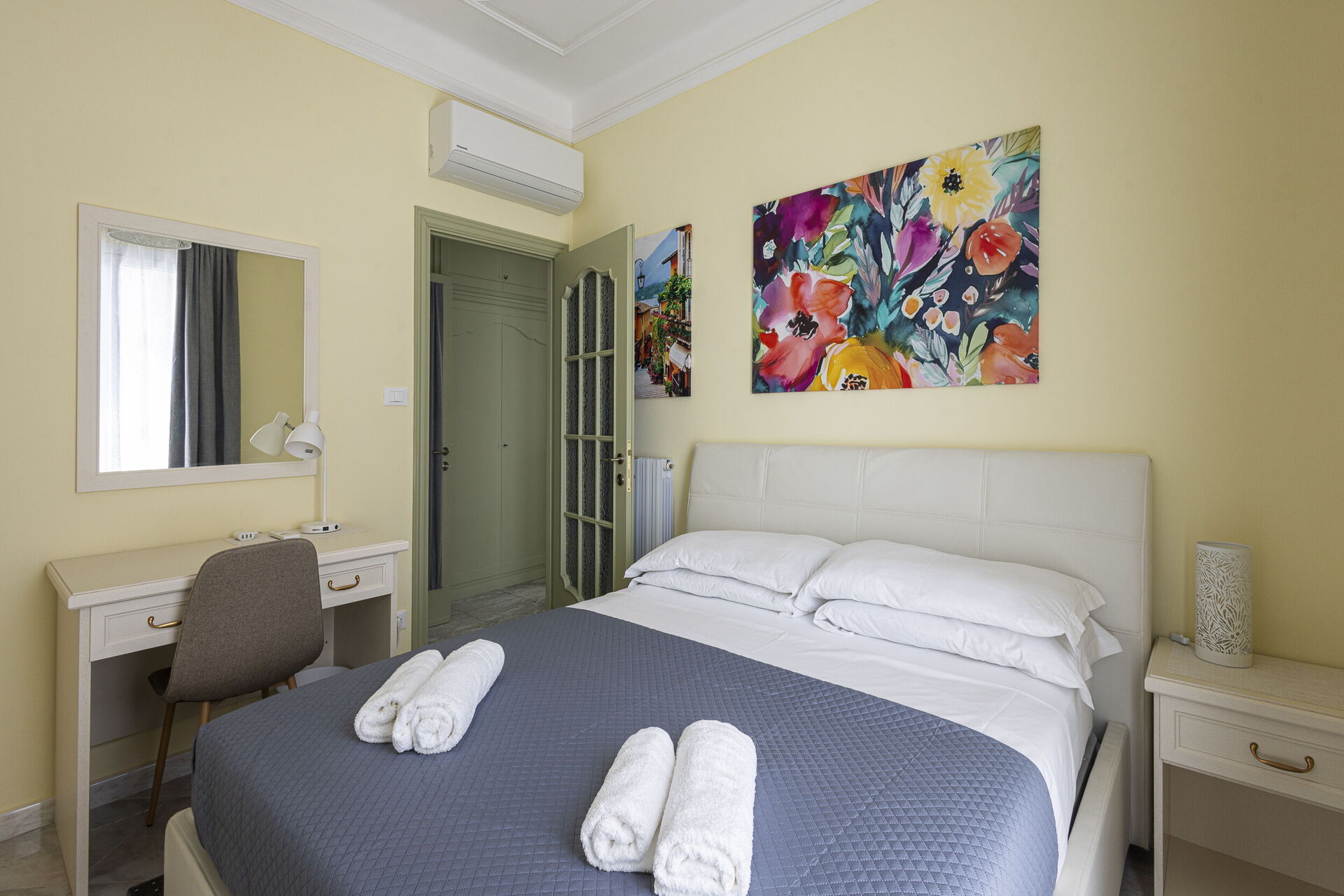 Habitación 1 (16 m2): cama doble (ancho: 1.6m, longitud: 2m), cuna, WIFI internet, aire acondicionado, sillón, escritorio, acceso al balcón.
