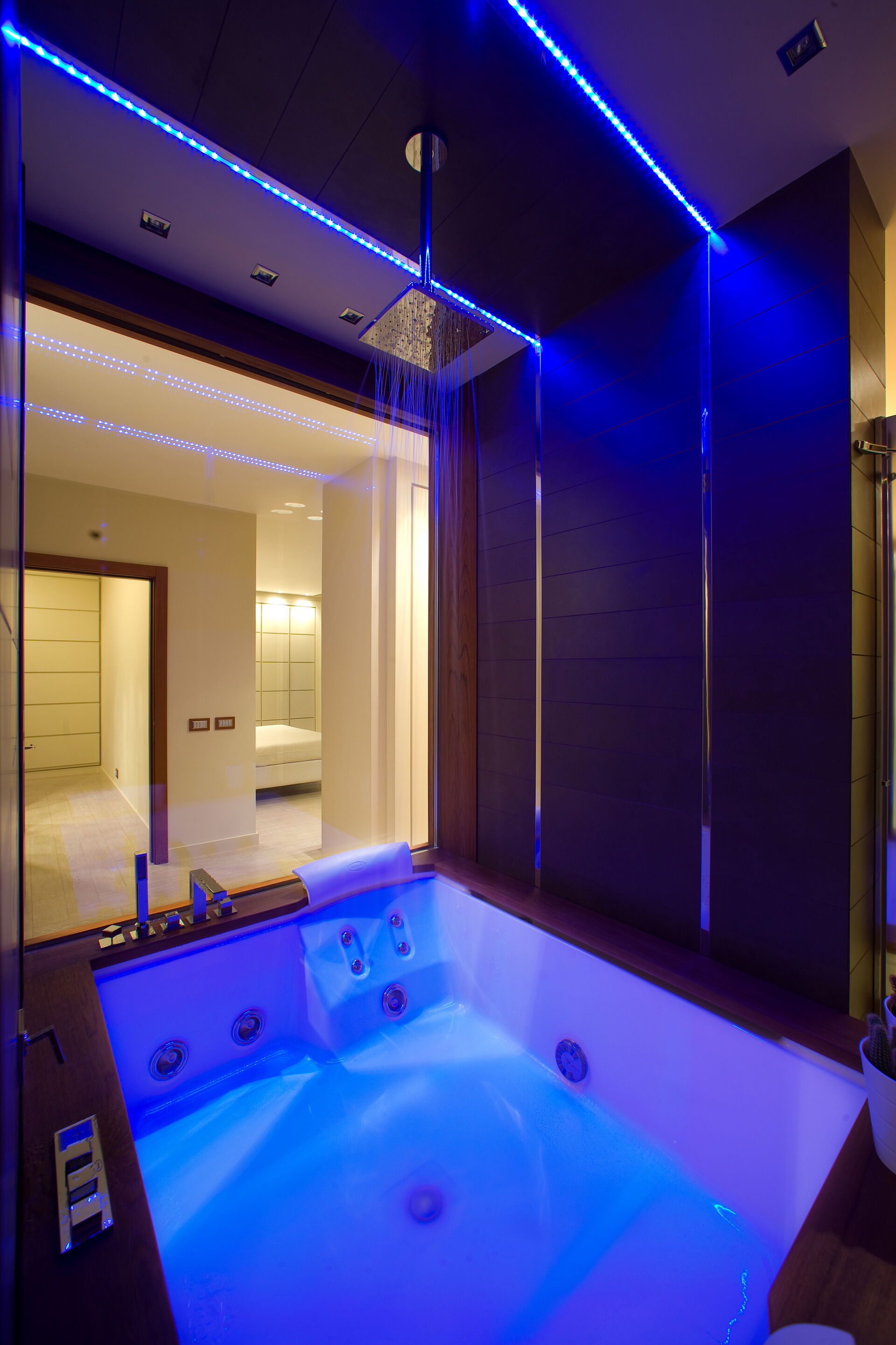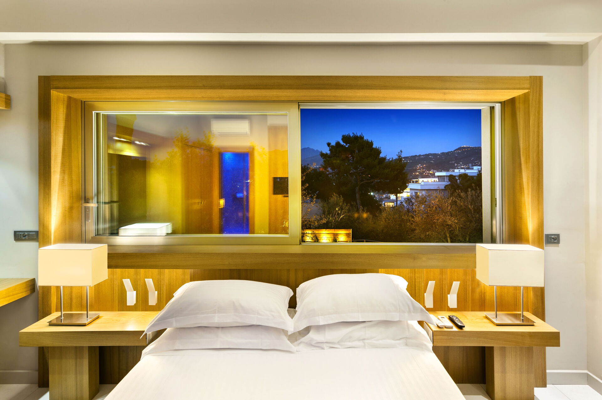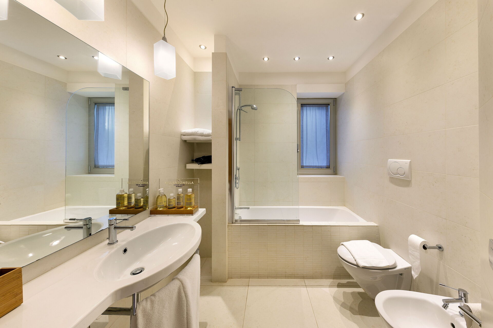 Habitación con baño 1: cama de matrimonio (ancho: 1.8m, longitud: 2m), WIFI internet, aire acondicionado, televisión, escritorio, seguridad, jacuzzi, lavabo, lavabo doble, dos baños, bidé, ducha, secador, detector de humo, acceso a la terraza.