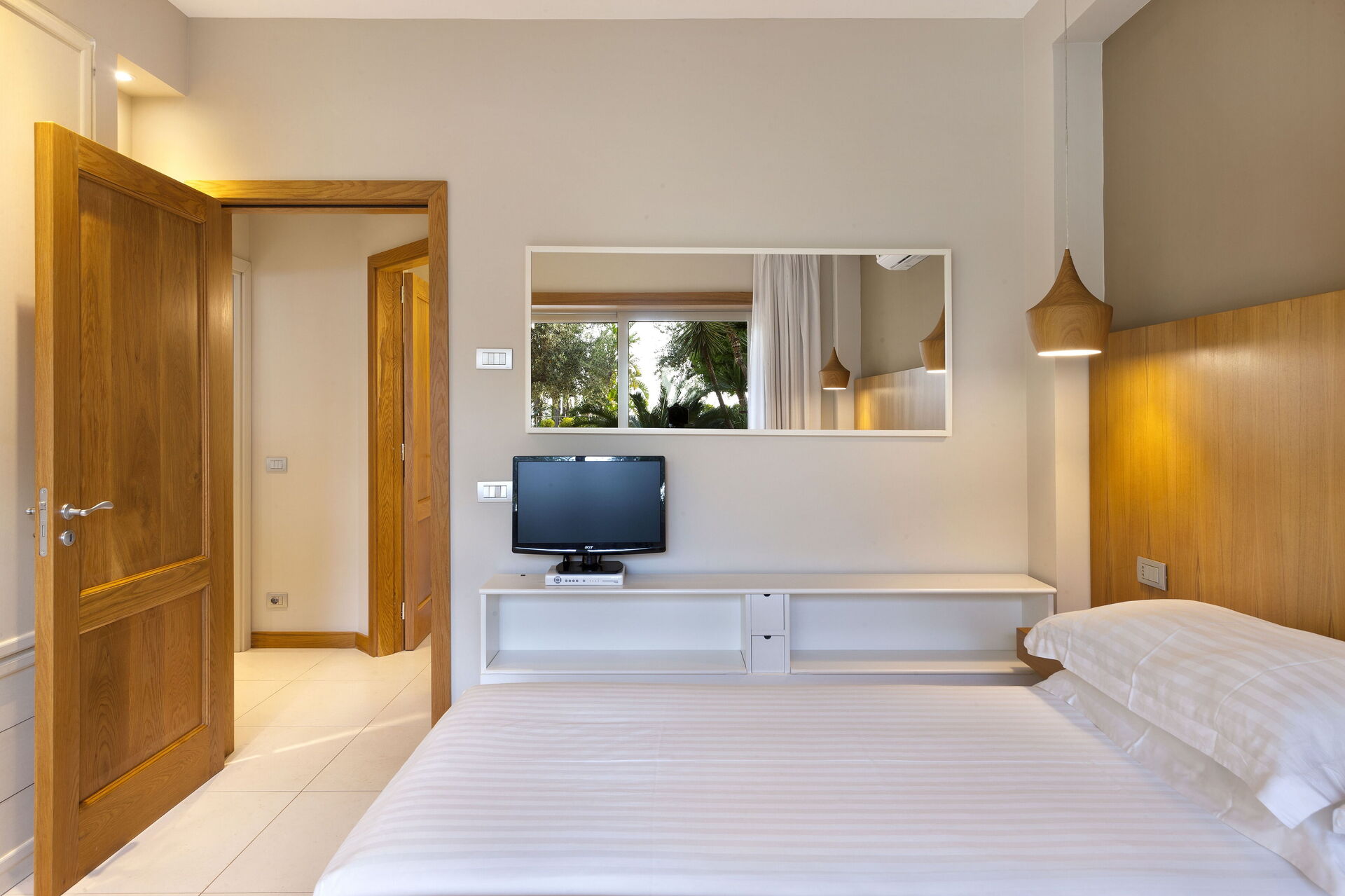 Habitación con baño 6: cama de matrimonio (ancho: 1.8m, longitud: 2m), cuna de bebe, WIFI internet, aire acondicionado, televisión, lavabo, baño, ducha, secador.