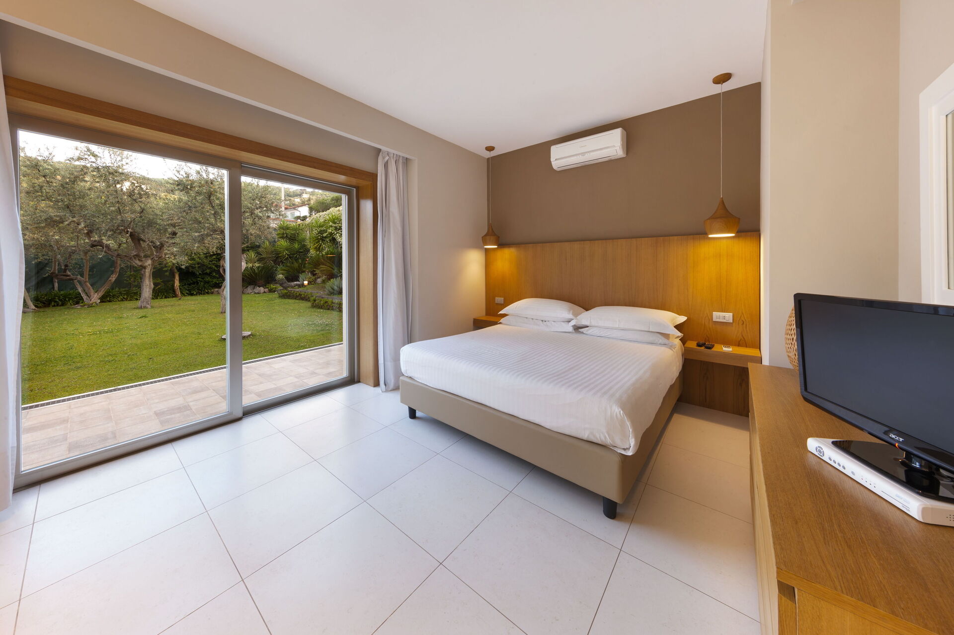 Habitación con baño 5: cama de matrimonio (ancho: 1.8m, longitud: 2m), cuna de bebe, WIFI internet, aire acondicionado, televisión, lavabo, baño, bidé, ducha, secador, acceso al jardín.