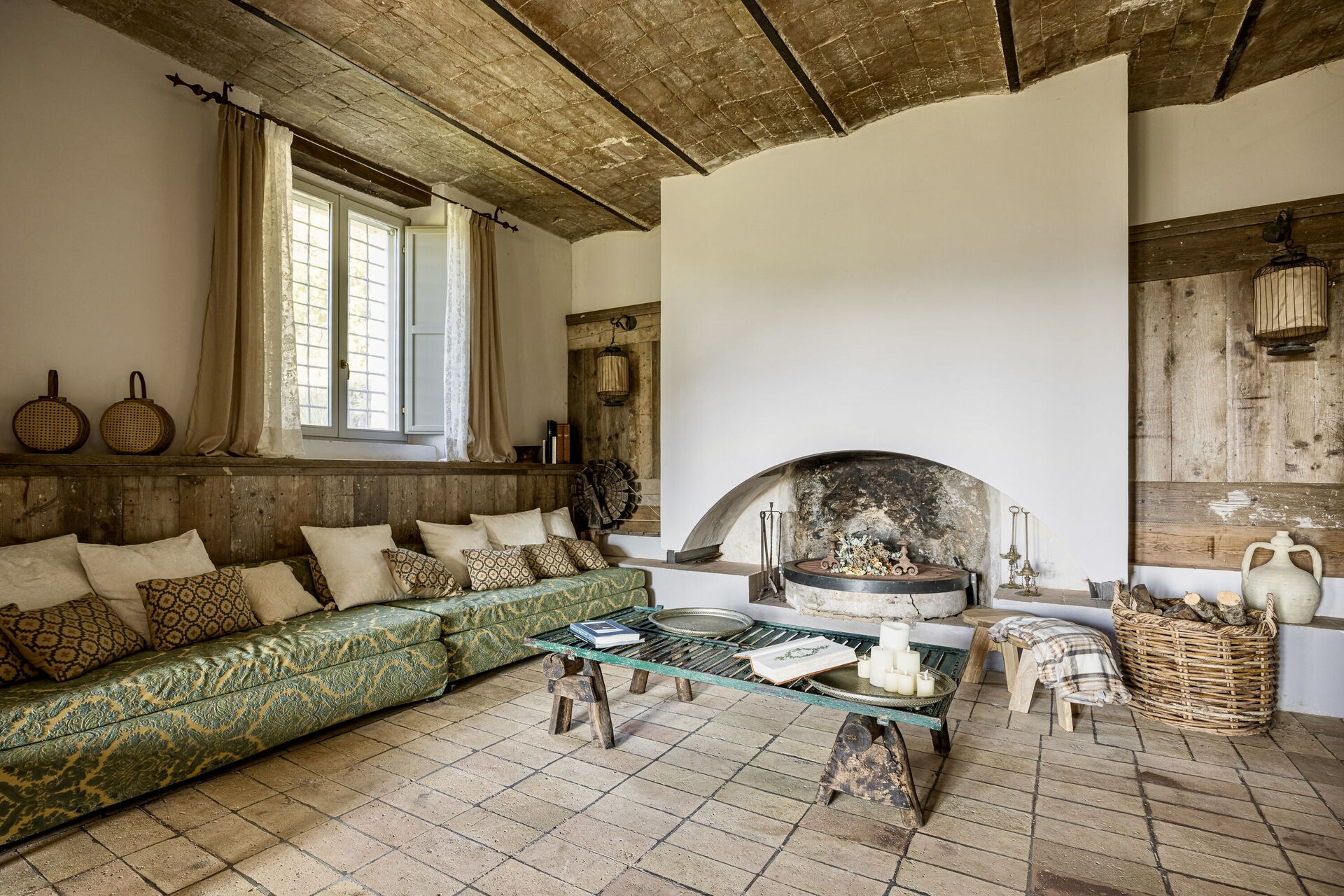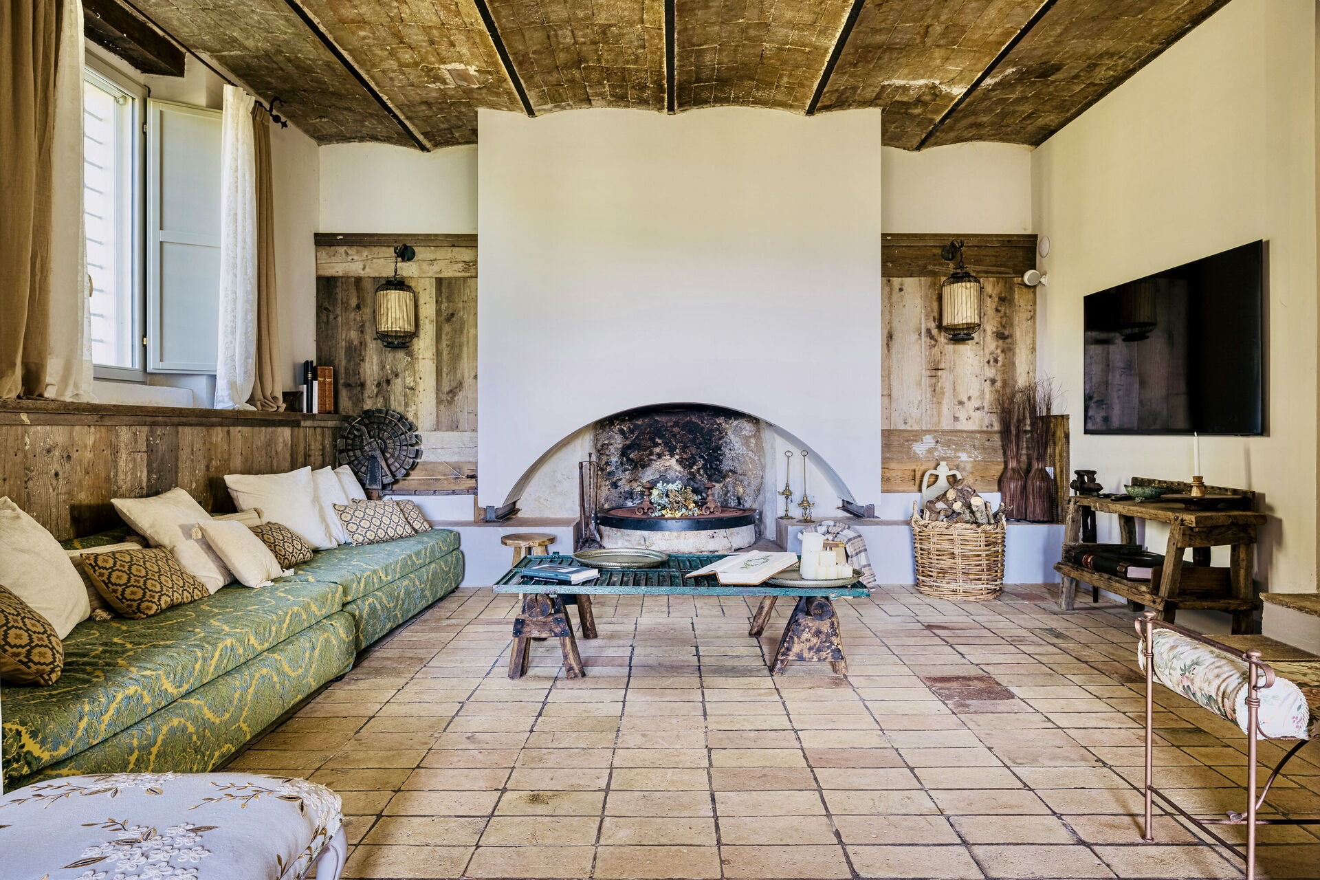 Salón (30 m2): sillón, chimenea, dos sofás camas (ancho: 1m, longitud: 2m), aire acondicionado, televisión, mosquitero.
