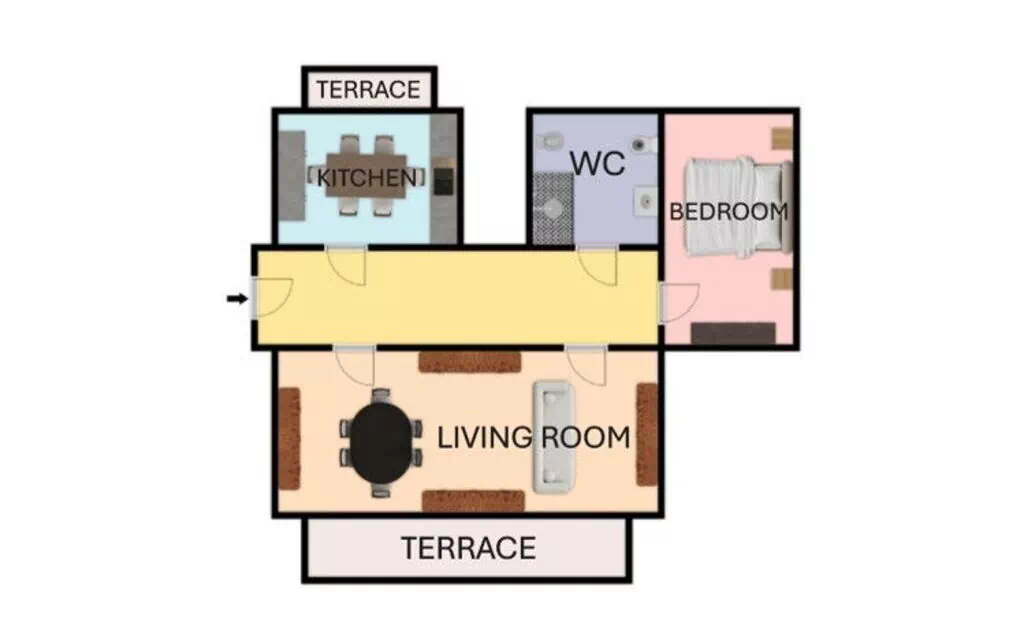 Salón: escritorio, sofá cama de matrimonio, WIFI internet, internet, tv vía satélite.