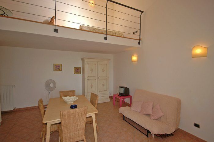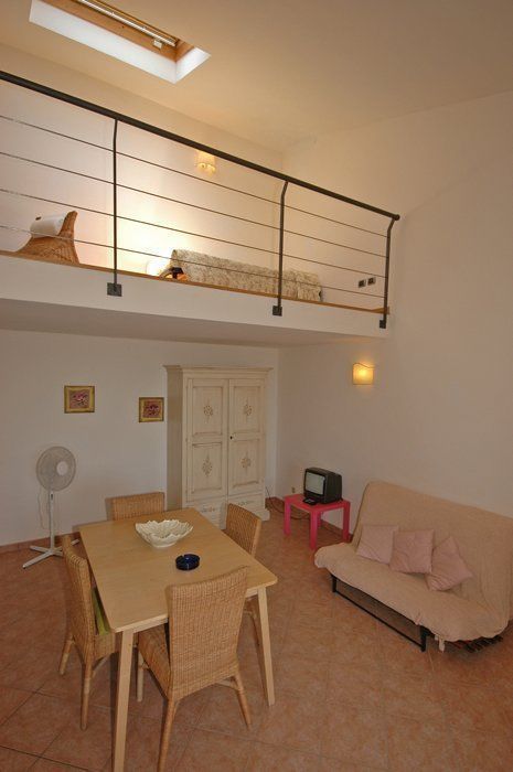1° Piso : Sala (TV) – comedor con cocina americana ( horno , freezer ) , cuarto matrimonial con vista al mar , baño con ducha.De la sala se accede a un altillo con una cama suplementar.