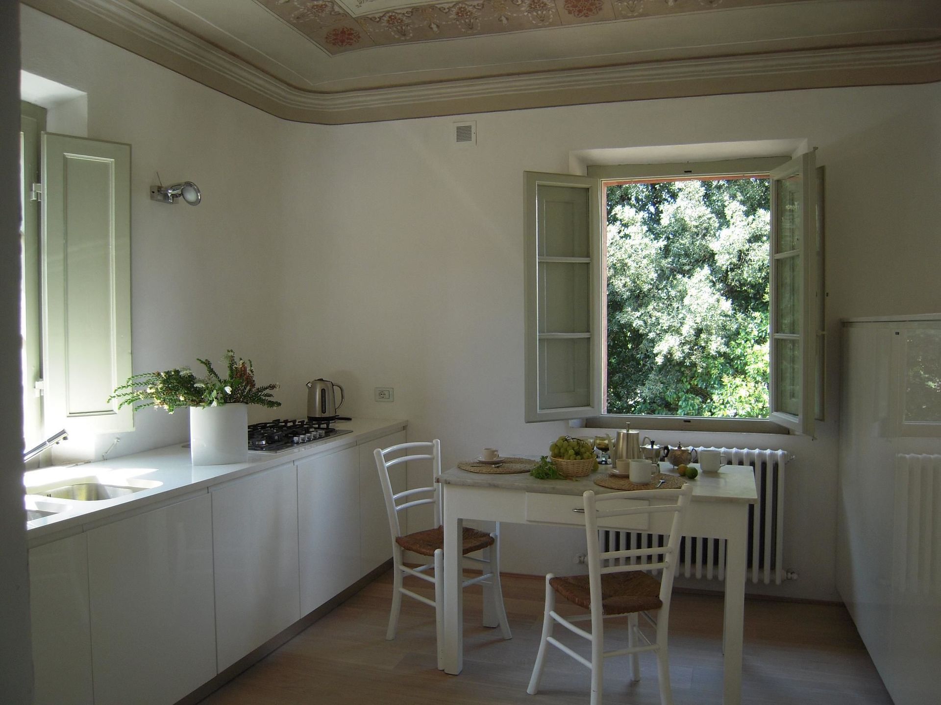 The spacious kitchen with twin corner windows opens on the dining room. It is furnished with a unitised white lacquered inclusive set with a white reconstituted stone top and an old white table with marble top and white wooden straw woven chairs. The ceiling is covered by a fresco painting.