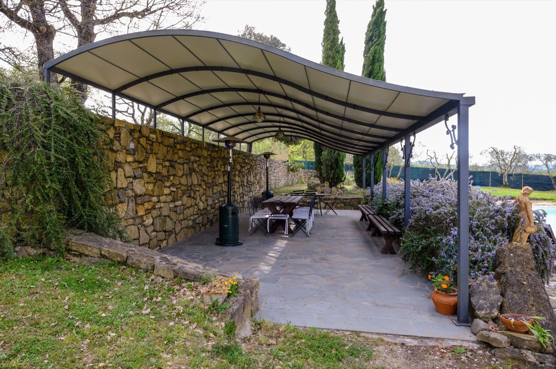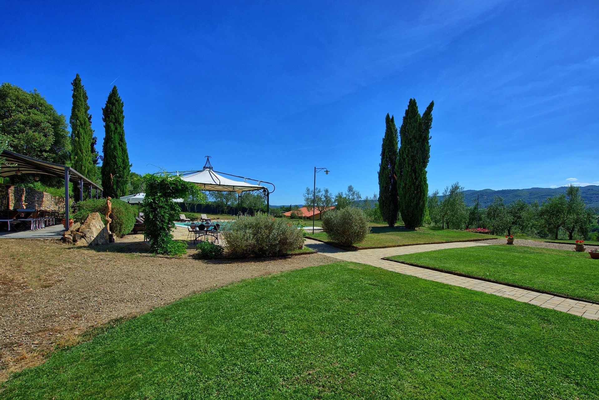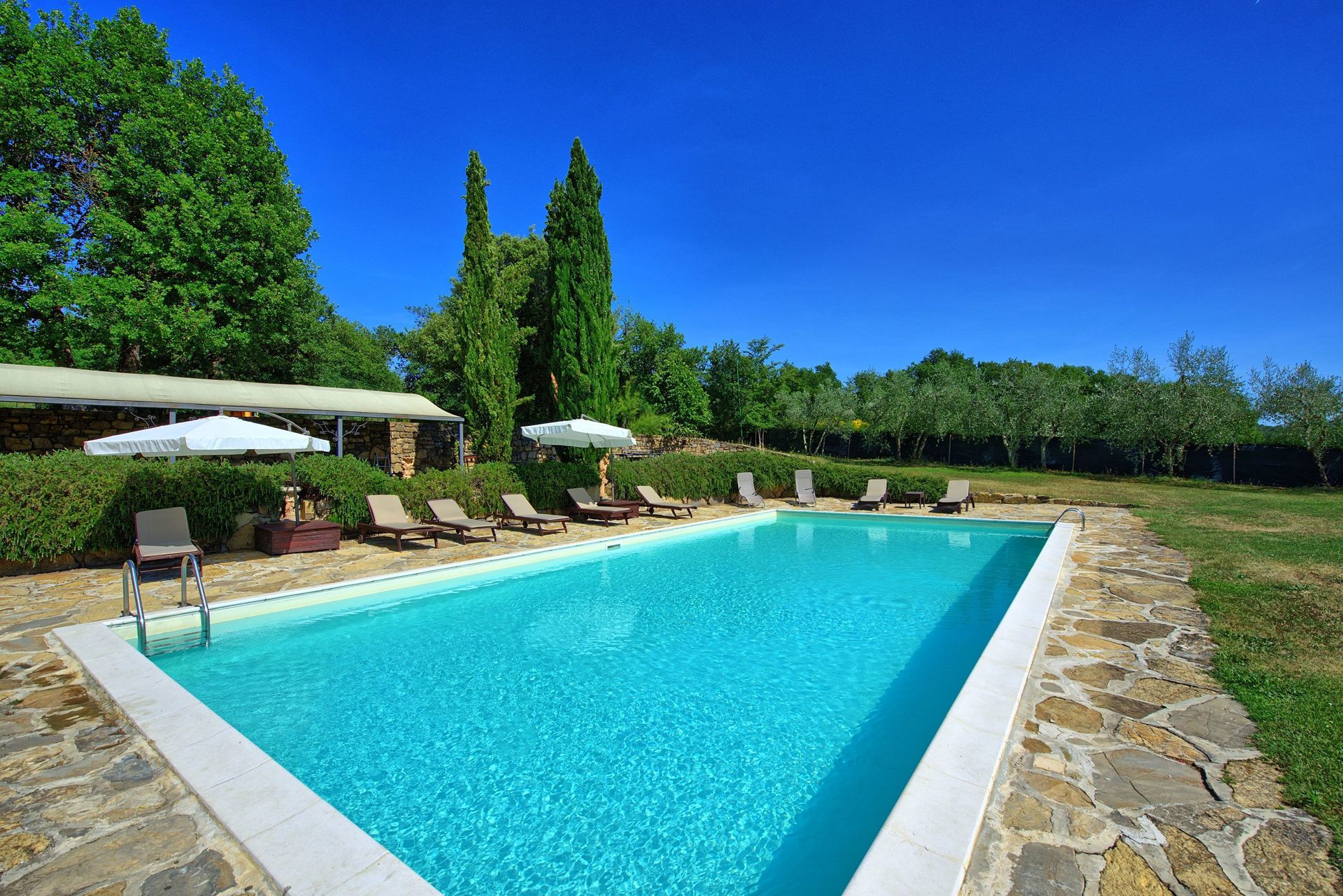At guests disposal: fenced furnished lawn (10.000 square meters) with lighted private pool (7 x 14 m – depth 1,5 m – open from 20/04 to 10/10), open-air shower, barbecue, large gazebo near the pool, valley-ball ground, charming loggia on the ground floor and panoramic terrace on the first floor.