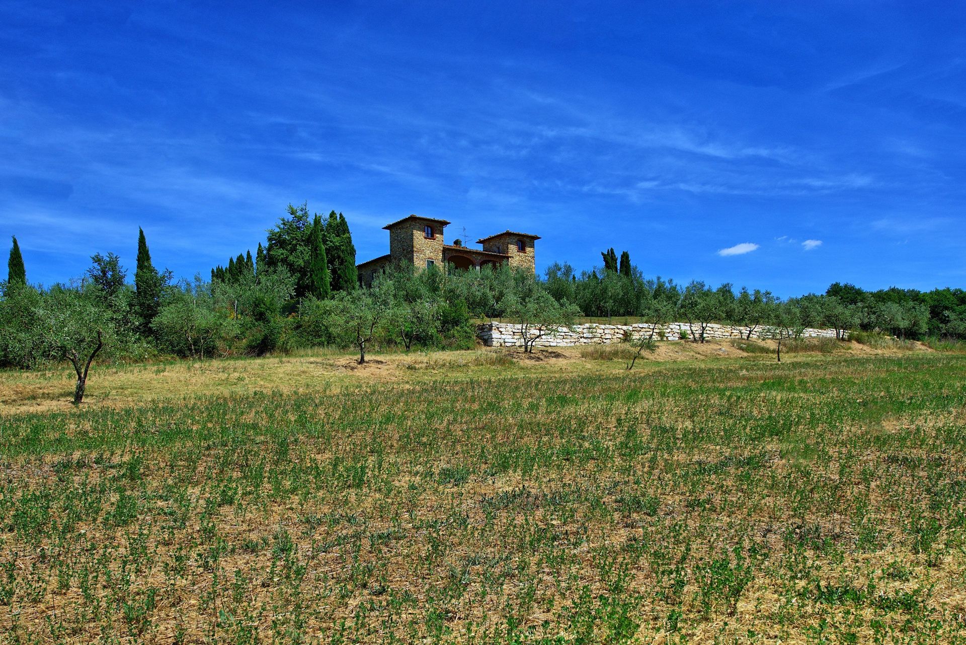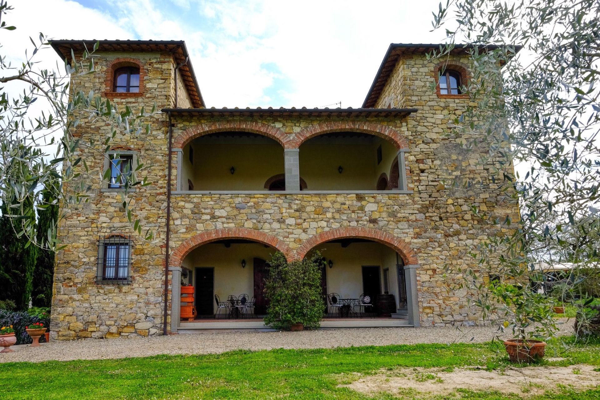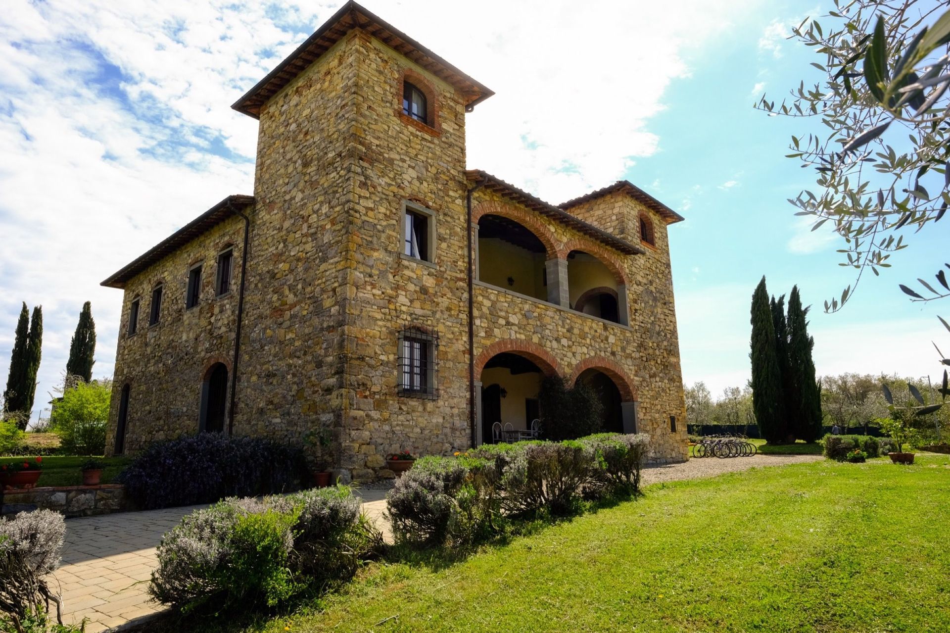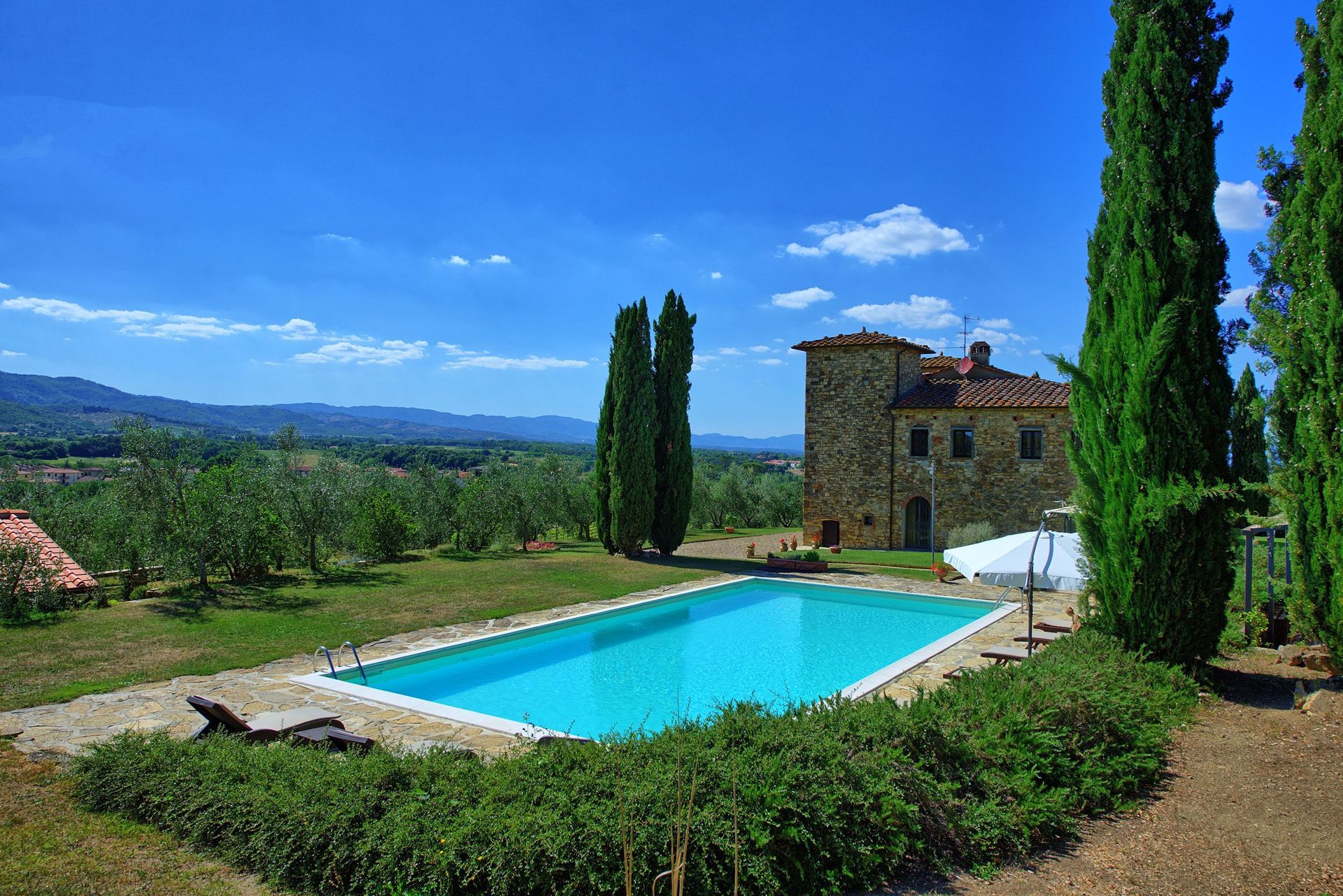 The property is in dominating and sunny location, amidst olive groves, and enjoys extensive vies over the surrounding landscape, over the small town of Bucine and the Chianti Classico hills in the distance.