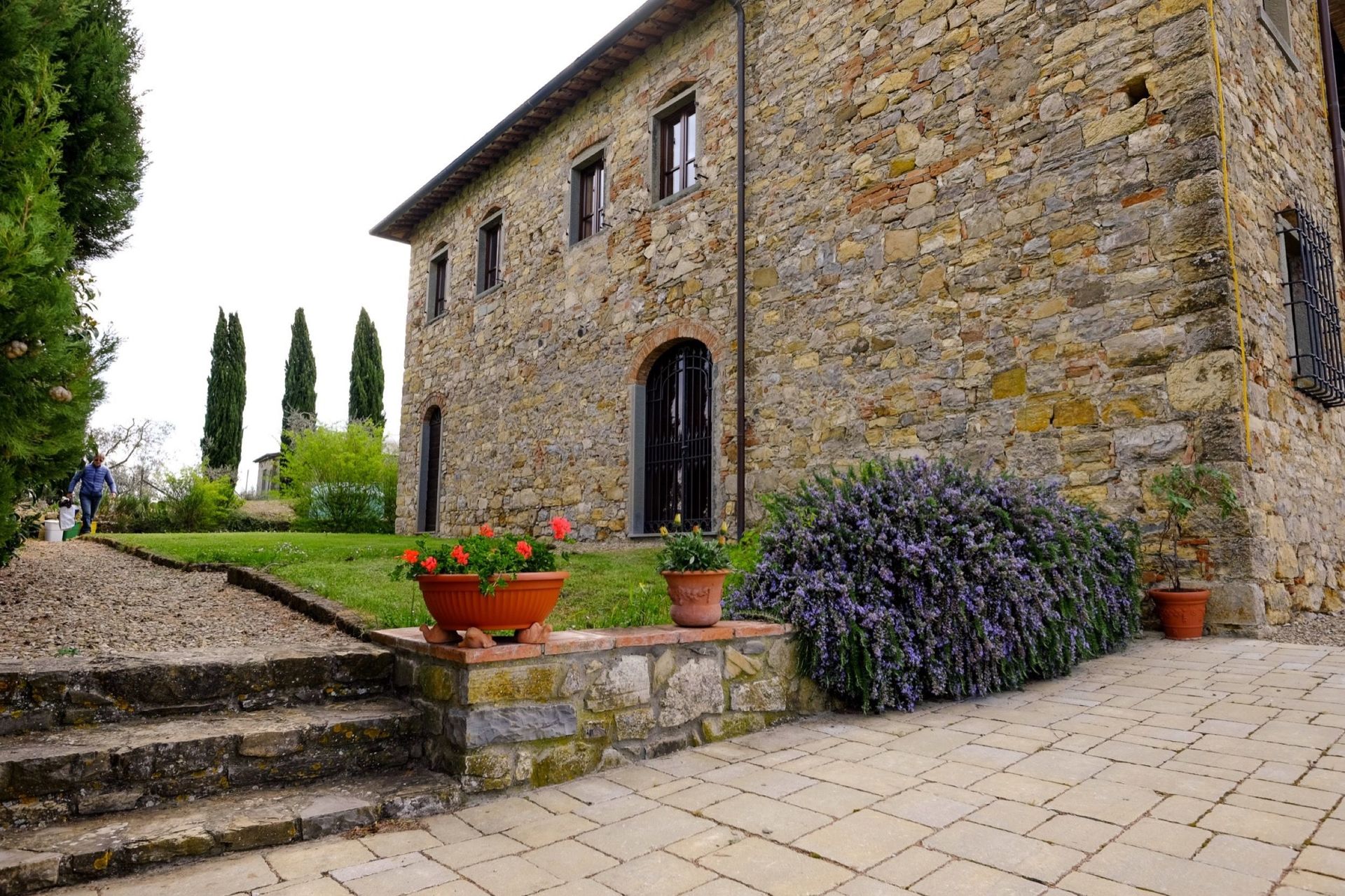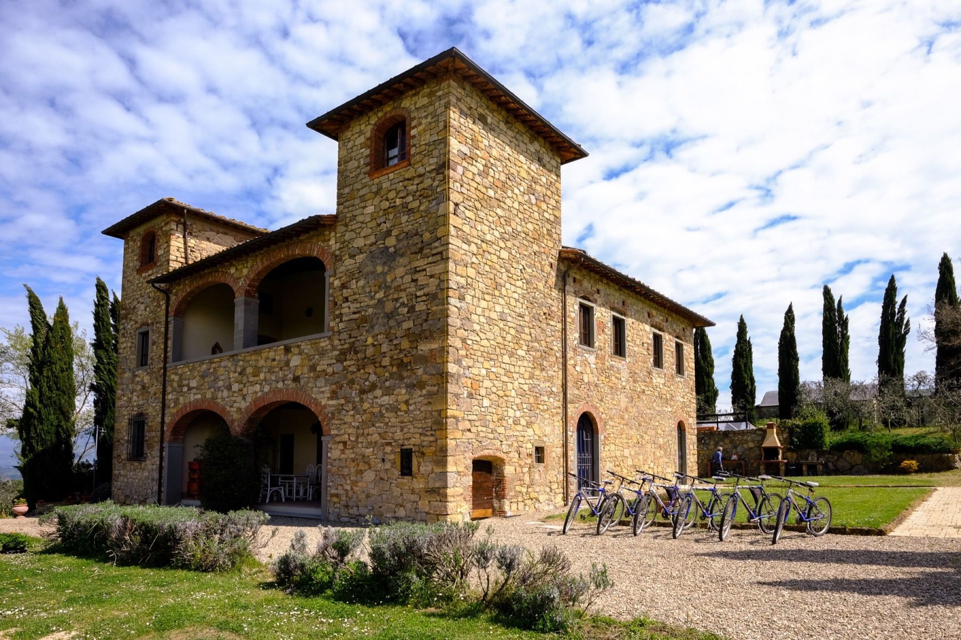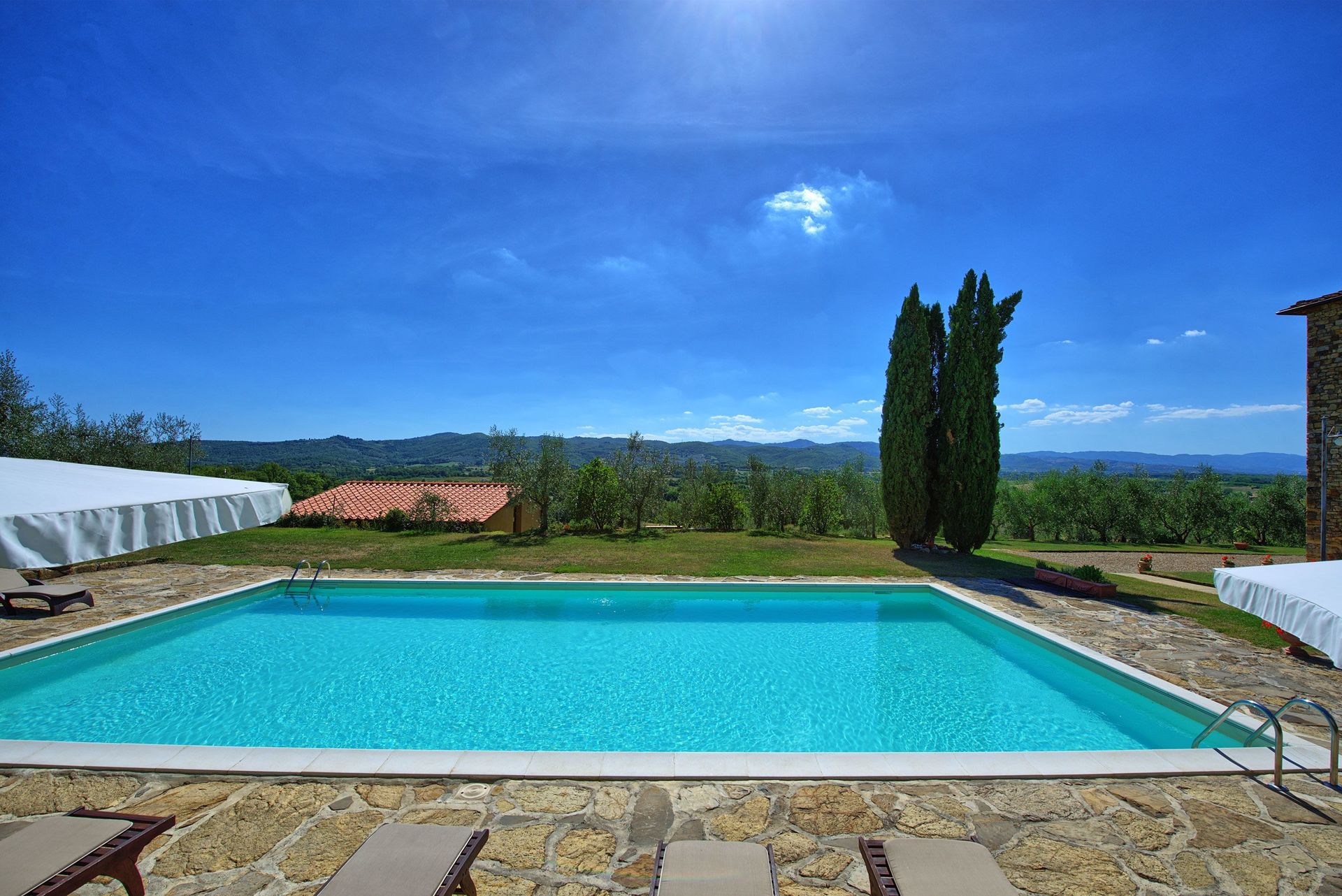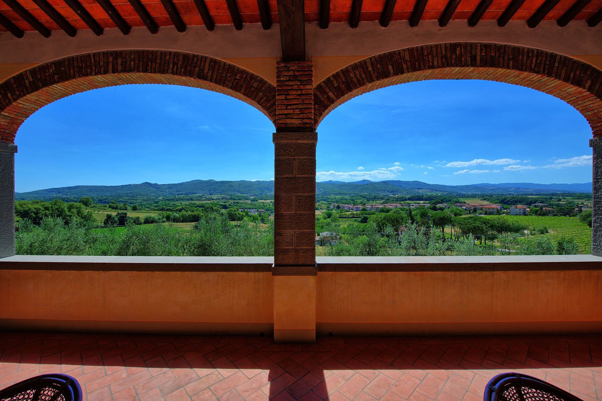 The property is in dominating and sunny location, amidst olive groves, and enjoys extensive vies over the surrounding landscape, over the small town of Bucine and the Chianti Classico hills in the distance.