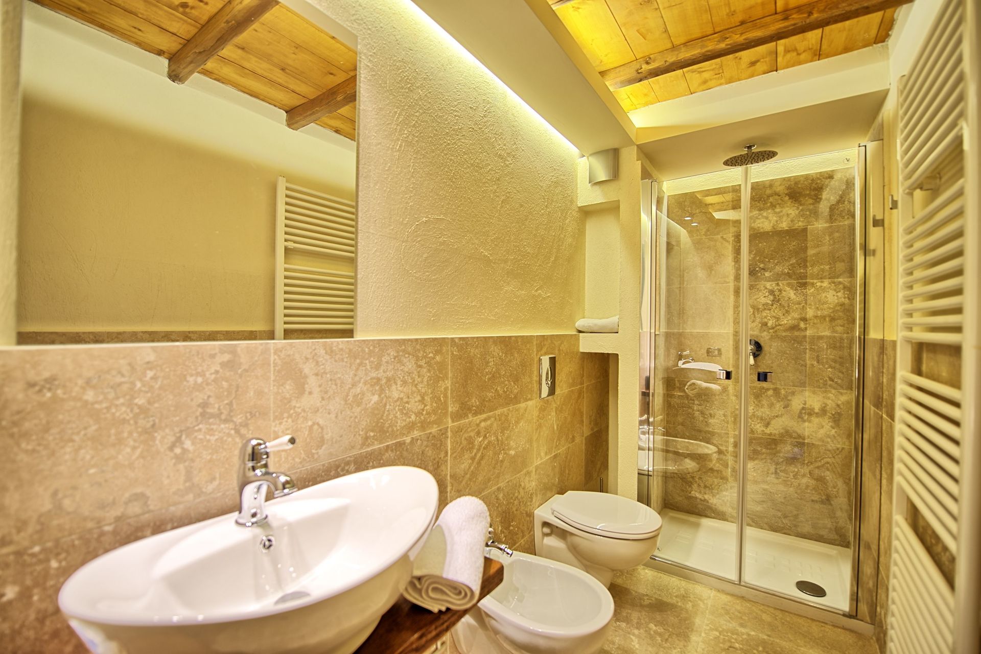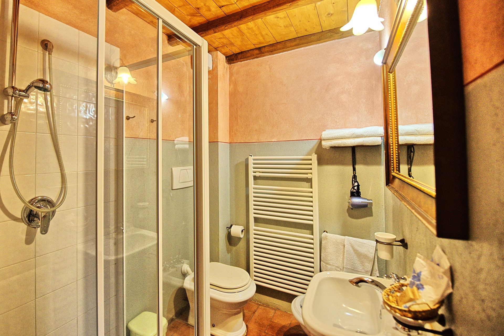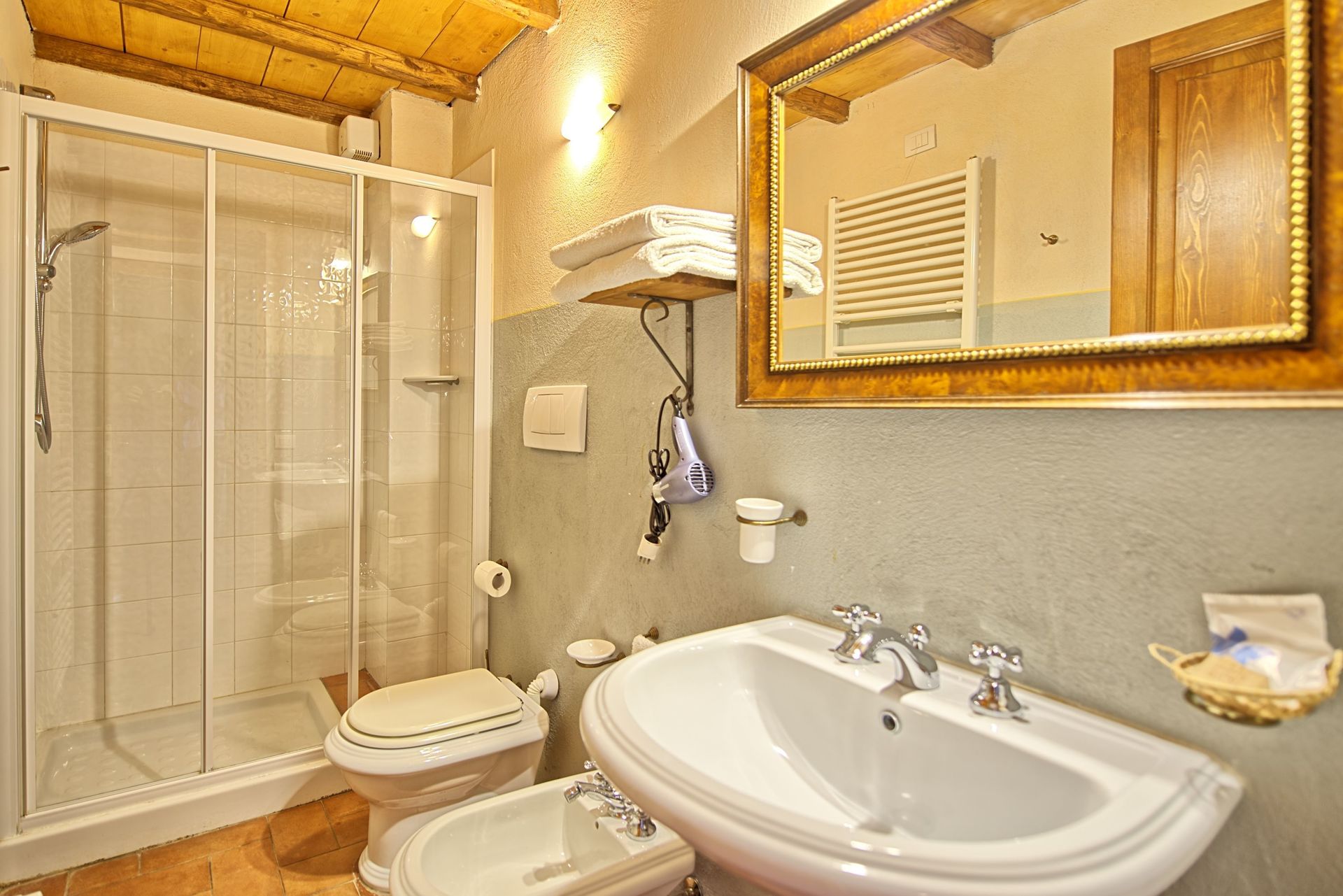 Ground floor (accessible via a nice loggia): living-room (satellite TV, hi-fi) with fireplace and dining area, small office with Internet and coffee maker, kitchen (2 ovens, small microwaves, dishwasher, freezer, ice maker, orange squeezer, toaster, American coffee maker, Italian coffeemaker) with access on to the garden, toilet, double bedroom (accessible only from the outside) with ensuite bathroom with shower, double bedroom suitable for disabled people (accessible only from the outside) with ensuite bathroom with shower.