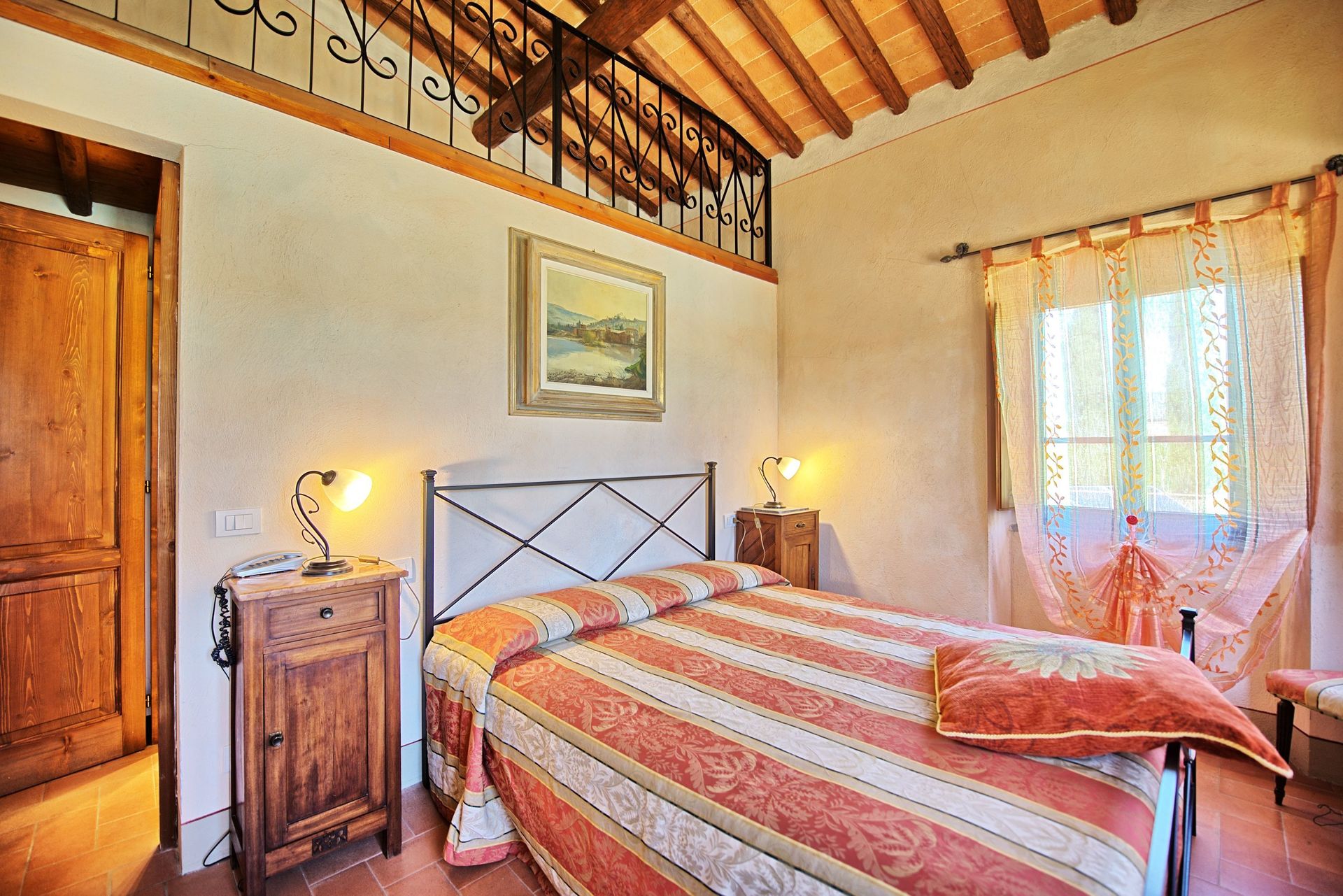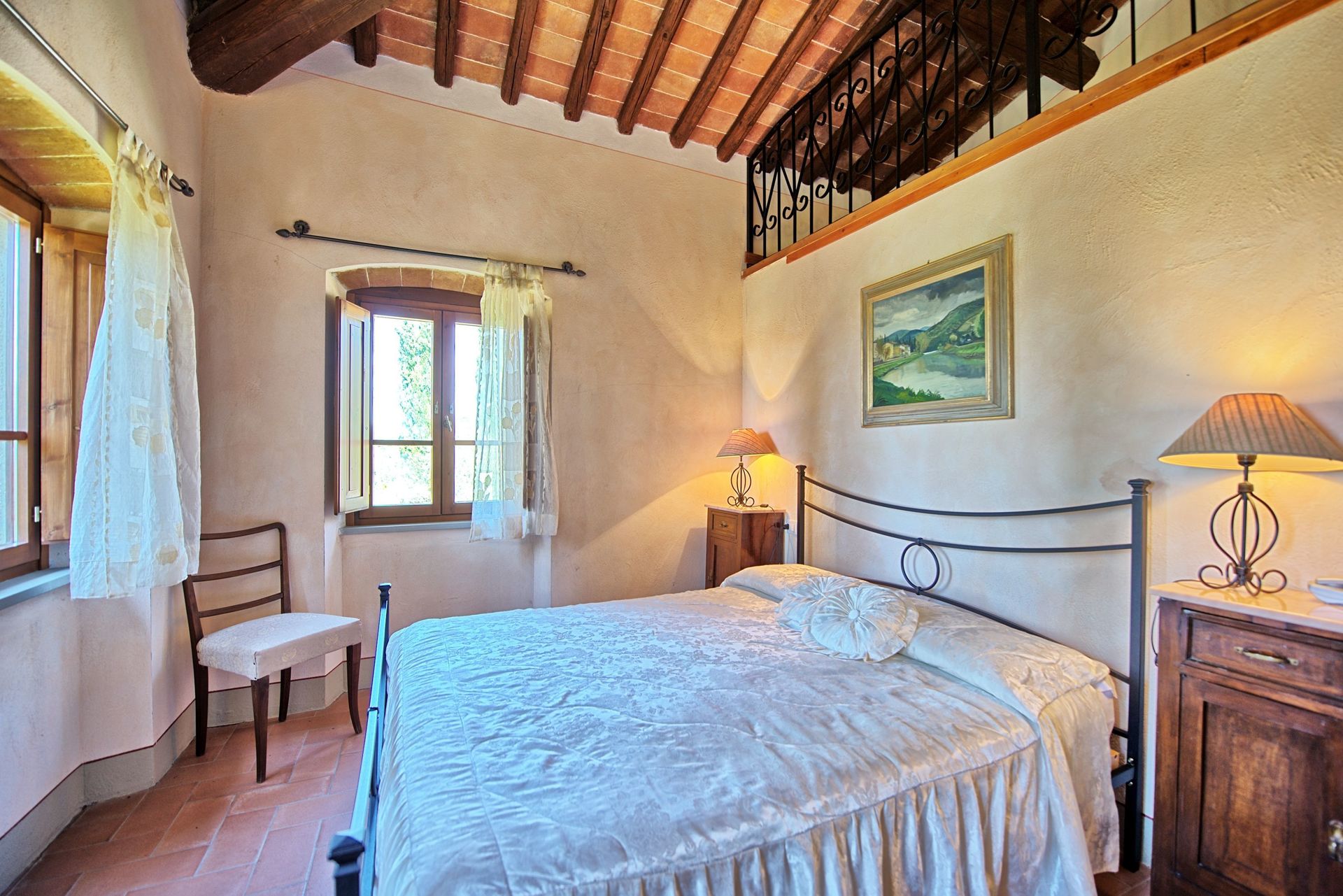 1st floor (accessible only via a large charming furnished loggia with panoramic views): living-room, 2 twin-bedded rooms with ensuite bathroom with shower and access to an open gallery with a single bed, 2 double bedrooms with ensuite bathroom with shower, double bedroom with ensuite bathroom with shower, dressing room and access to an open gallery with a sofa.
