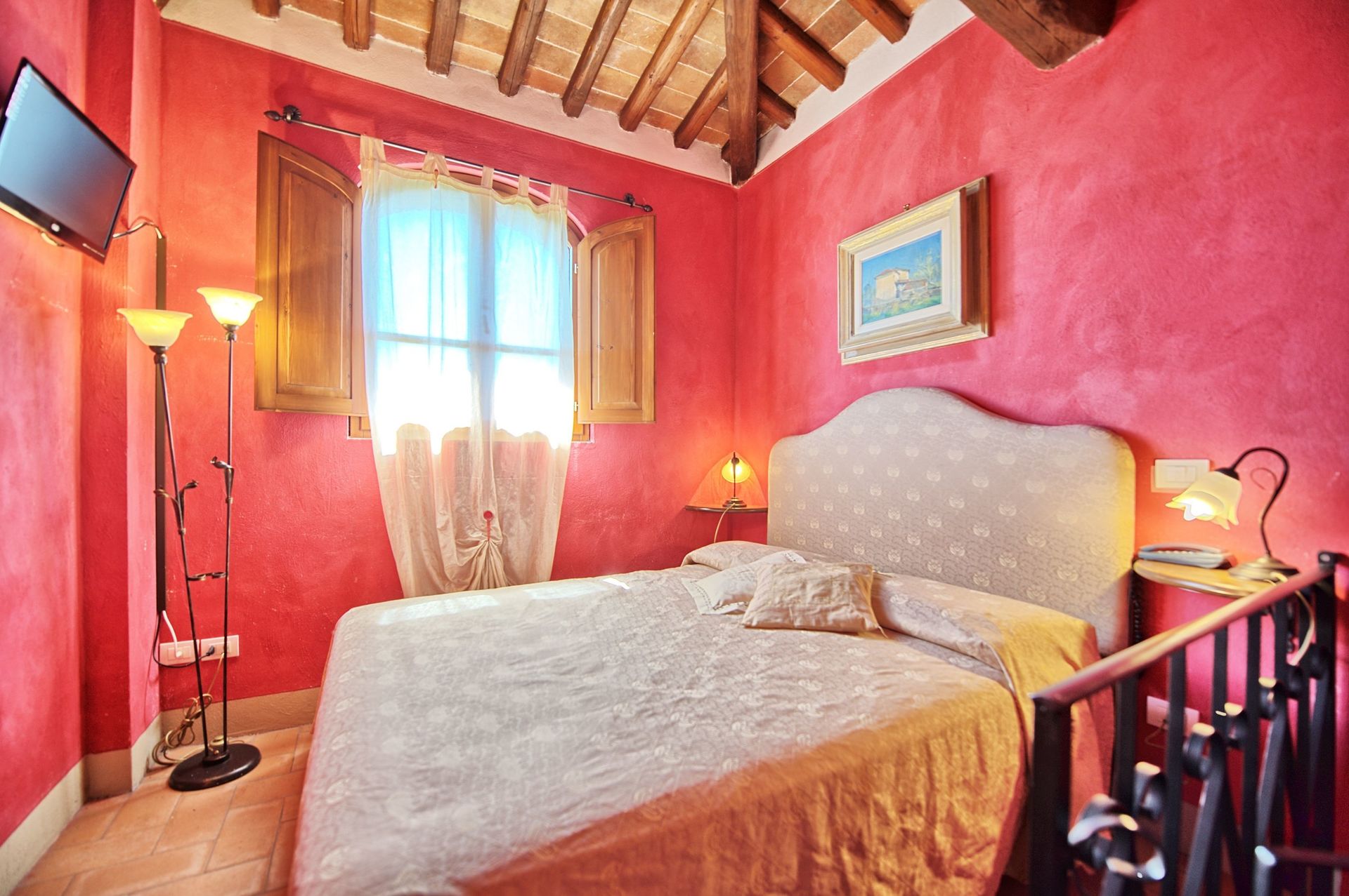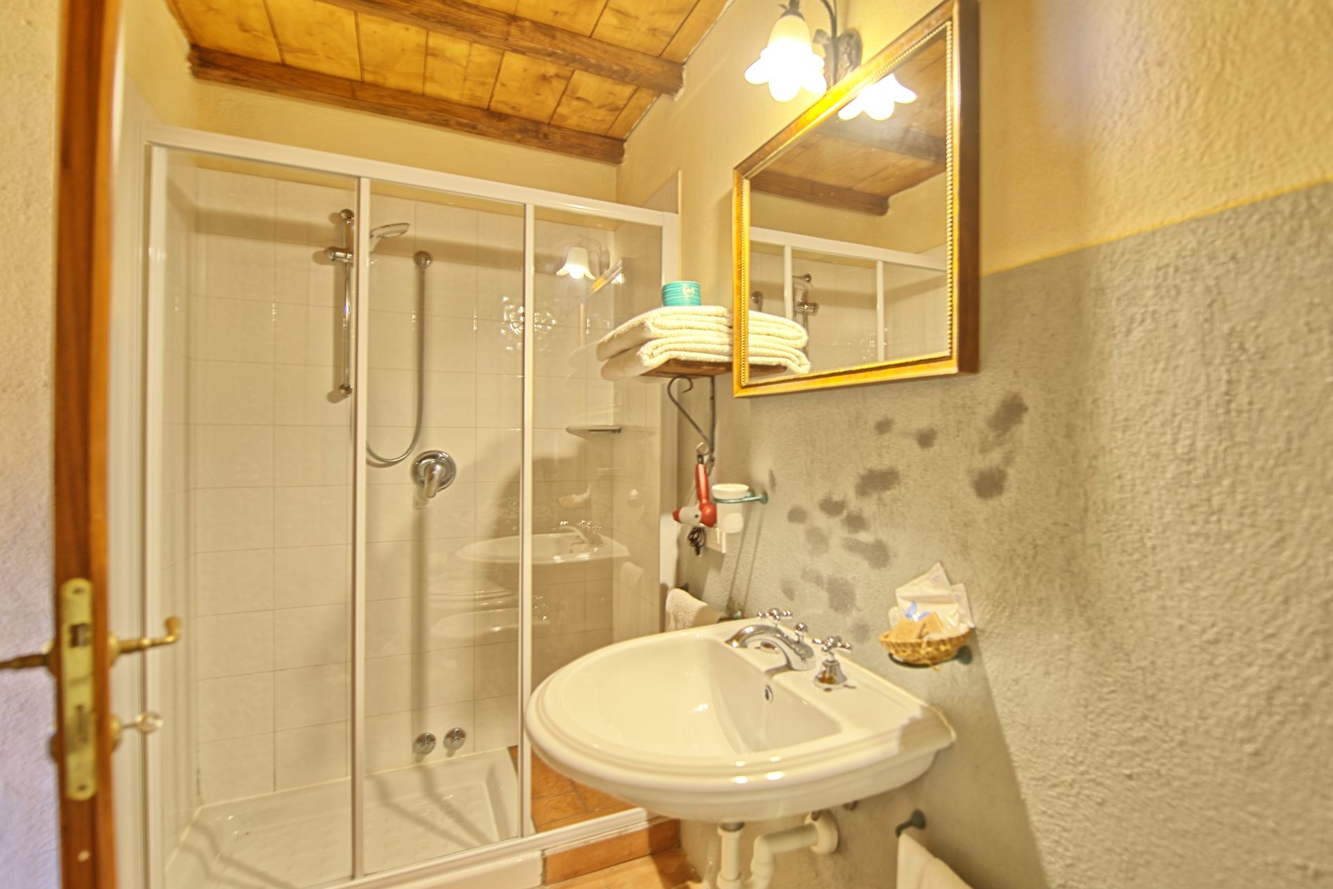 2nd floor (accessible only from the loggia on the 1st floor via a spiral staircase): open double bedroom (without door) with ensuite bathroom with shower.