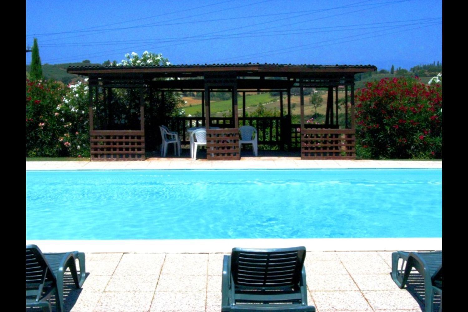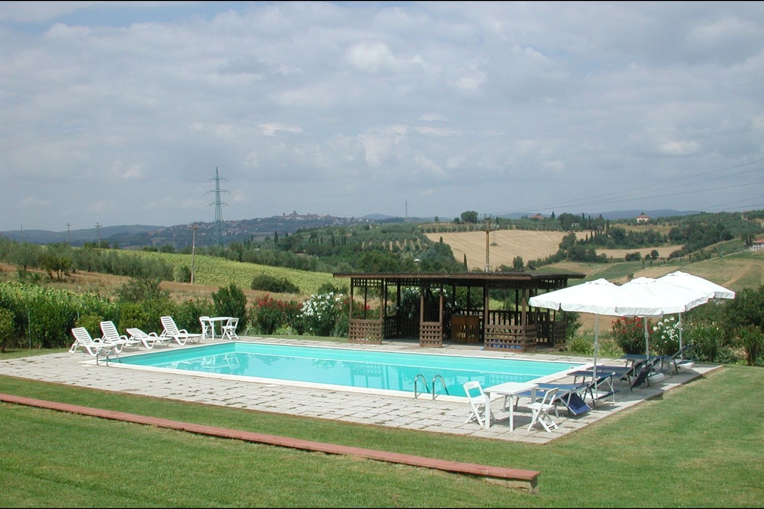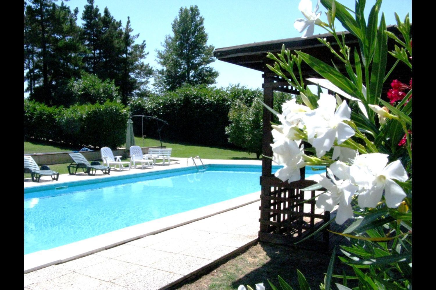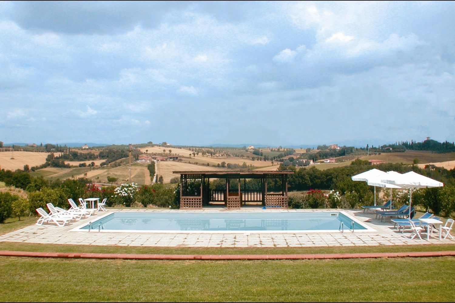 Enormous farmhouse in brick and stone situated on a hilltop. The nearby village of Foiano is one of the most important centres in Valdichiana, with shops and services of all types and innumerable cultural and folk festivals, which make the area an enjoyable holiday destination. Because of the large number of beds available and the large communal spaces, both inside and outside, the house is suitable for large families or groups of friends who want to spend a holiday together in absolute freedom. The garden that surrounds the house is completely fenced off, shaded by tall plants and equipped with garden furniture and a barbecue. The beautiful 6 x 12 m swimmimg pool, built in a sunny, panoramic position, provides an excellent, fun way to keep cool during the hot summer days. Furnishing in the house is simple but comfortable.