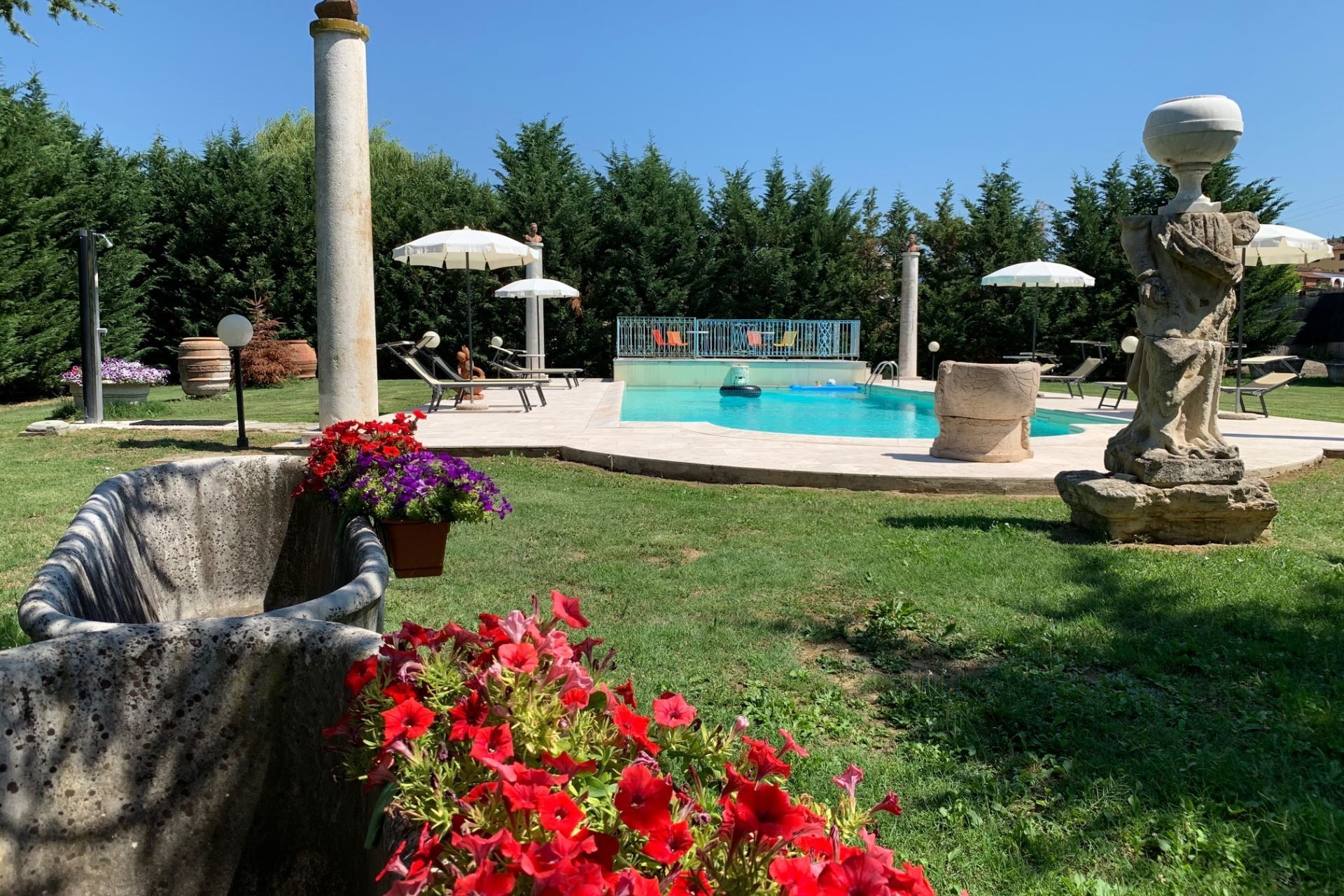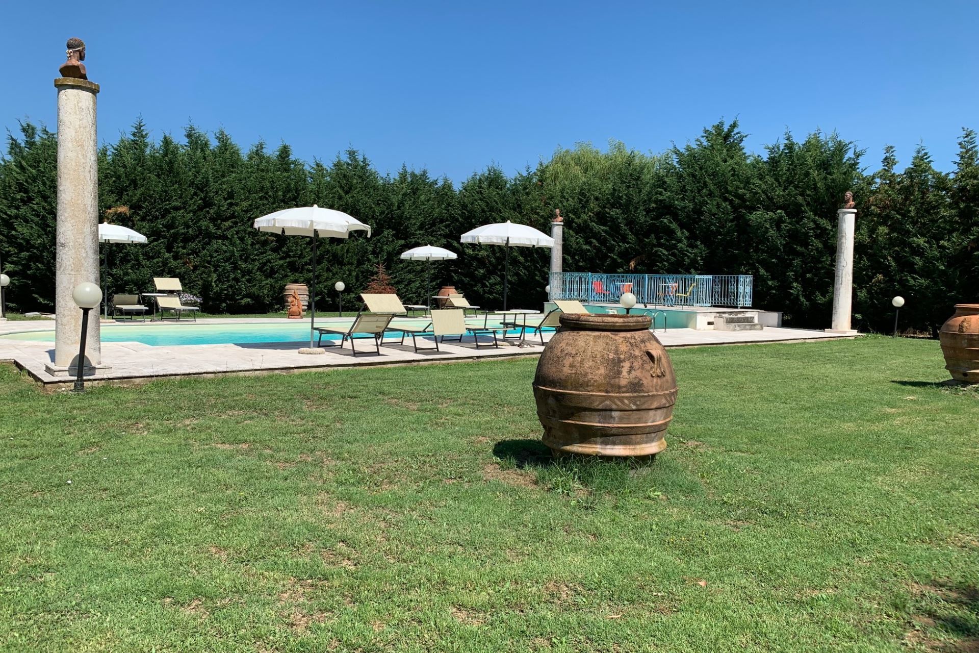 The highlights of the villa, in our opinion, are certainly the splendid swimming pool with Roman staircase (size m 16x6, depth m. 1.40-2.00 - open from 27 June to 5 September) decorated with precious marble and with changing room and bathroom with shower, the characteristic pergola covered with wisteria and roses with marble fountain and wooden benches where you can spend dreamy days in the company of your book.
