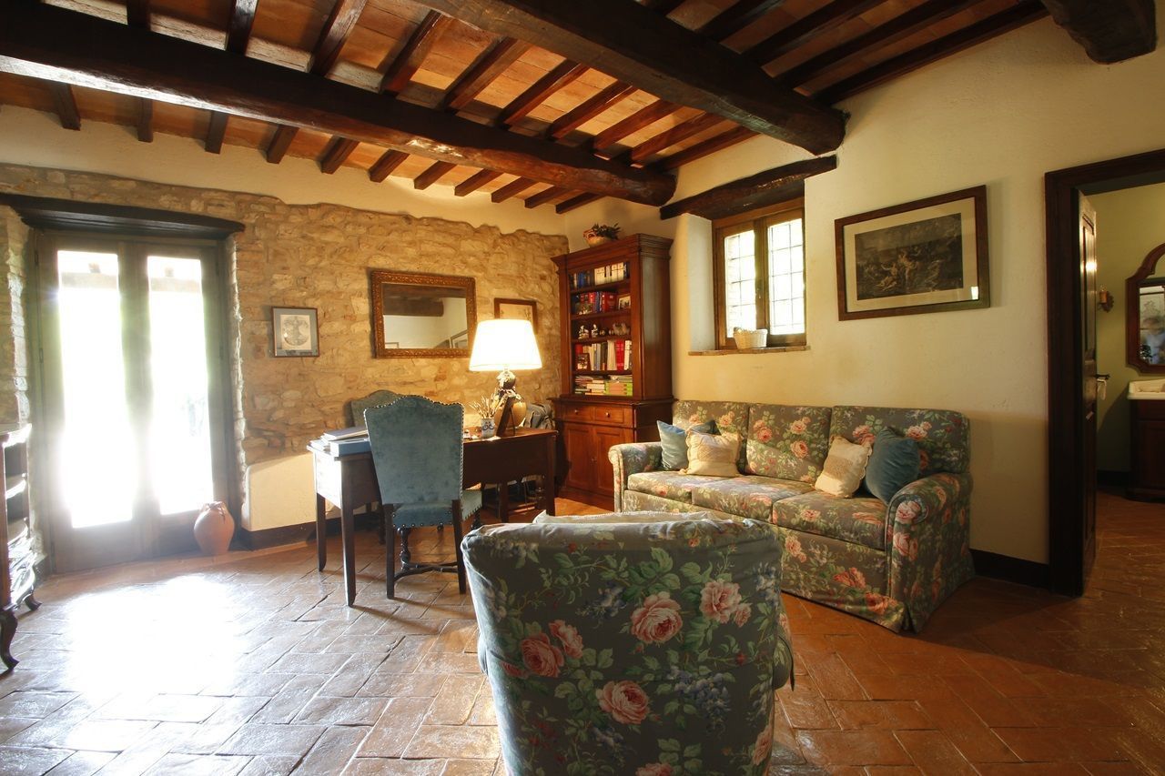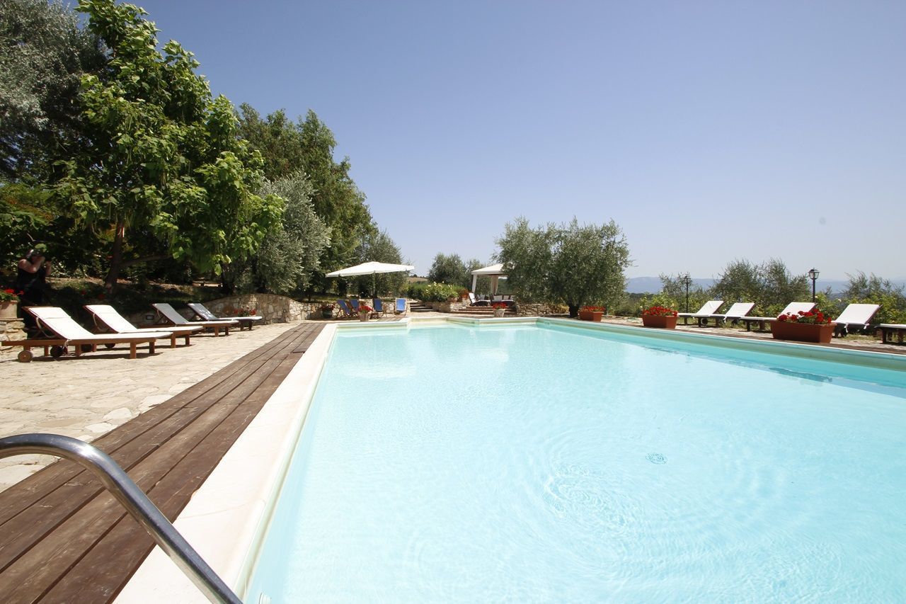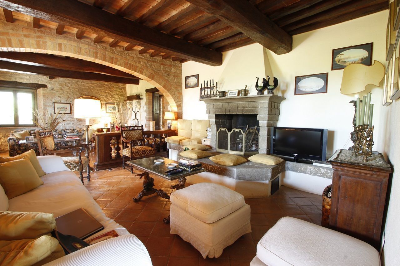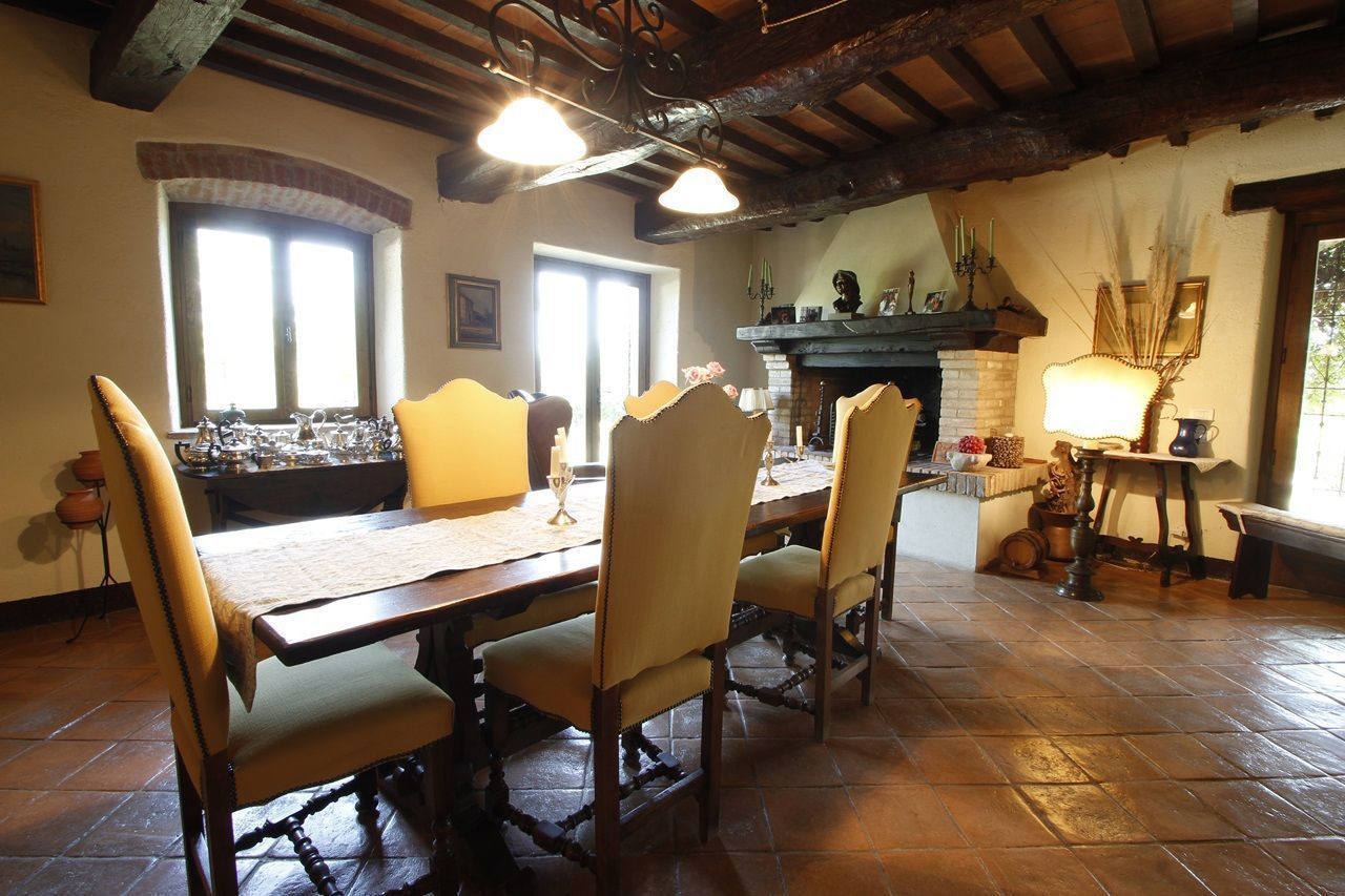 The interiors have been furnished with taste and elegance and they create the warm and inviting atmosphere typical of country manor houses, with large fireplaces in the living room and in dining room areas and bathrooms decorated with ancient tiles; the services include telephone/fax, an intercom system throughout the house and wireless Internet. Outside is a park whit fruit and olive trees and a garden created with great passion by the owner, full of flowers, ornamental plants and Mediterranean essences, with 3 lawns that will let you eat and relax outdoors while enjoying the enchanting panorama and an equipped pergola with a dining table that seats 20-30 people. Next to the large panoramic pool (14x7m) is a gazebo equipped with armchairs, sofas and tables with a splendid 360° view, a changing room with shower (in and outdoor) and an outdoor kitchen with barbecue. The caretakers live in a separated cottage inside the property. They tend to the daily cleaning of the house (and on request also cooking service) as well as tending to the garden and the swimming pool.
