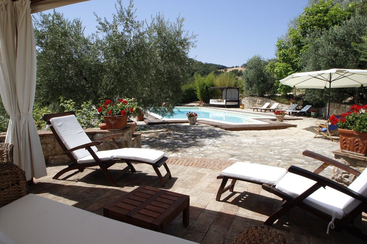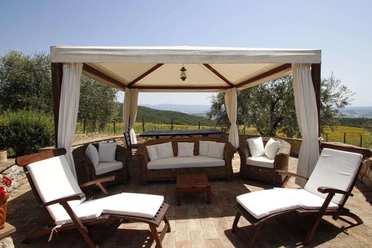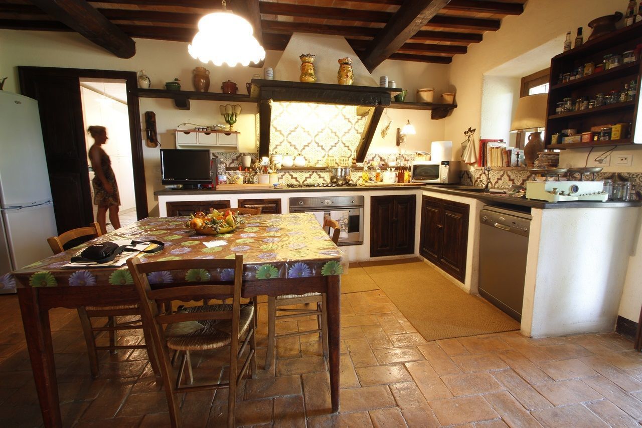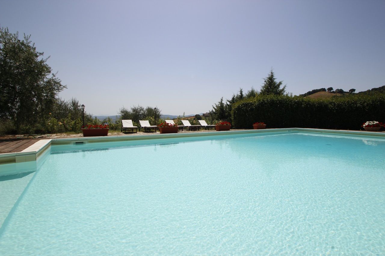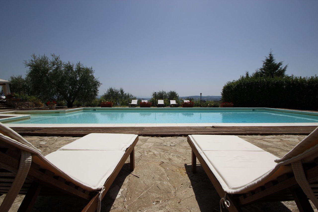 The interiors have been furnished with taste and elegance and they create the warm and inviting atmosphere typical of country manor houses, with large fireplaces in the living room and in dining room areas and bathrooms decorated with ancient tiles; the services include telephone/fax, an intercom system throughout the house and wireless Internet. Outside is a park whit fruit and olive trees and a garden created with great passion by the owner, full of flowers, ornamental plants and Mediterranean essences, with 3 lawns that will let you eat and relax outdoors while enjoying the enchanting panorama and an equipped pergola with a dining table that seats 20-30 people. Next to the large panoramic pool (14x7m) is a gazebo equipped with armchairs, sofas and tables with a splendid 360° view, a changing room with shower (in and outdoor) and an outdoor kitchen with barbecue. The caretakers live in a separated cottage inside the property. They tend to the daily cleaning of the house (and on request also cooking service) as well as tending to the garden and the swimming pool.
