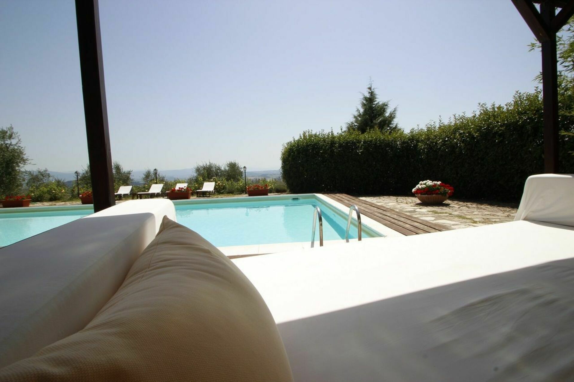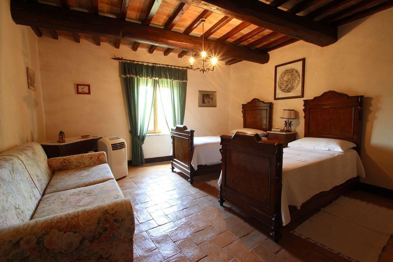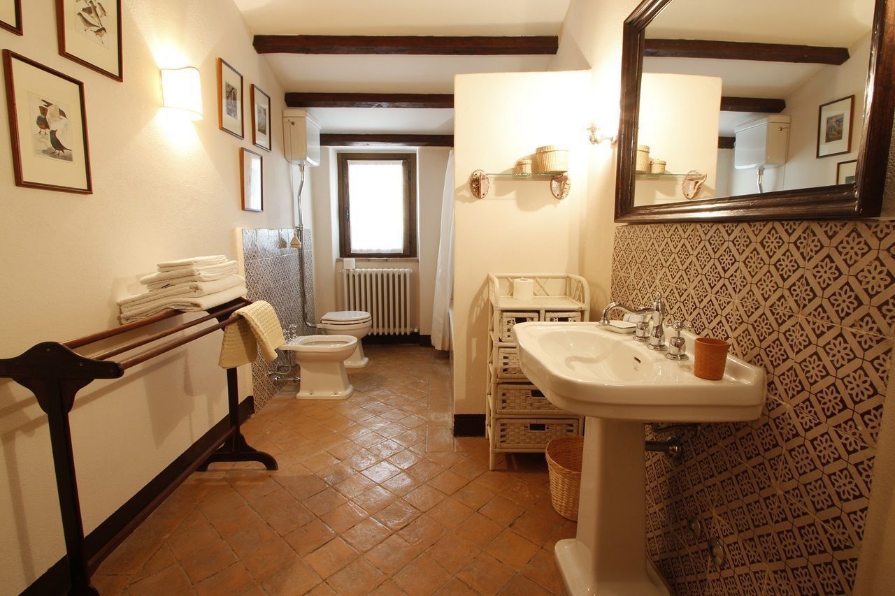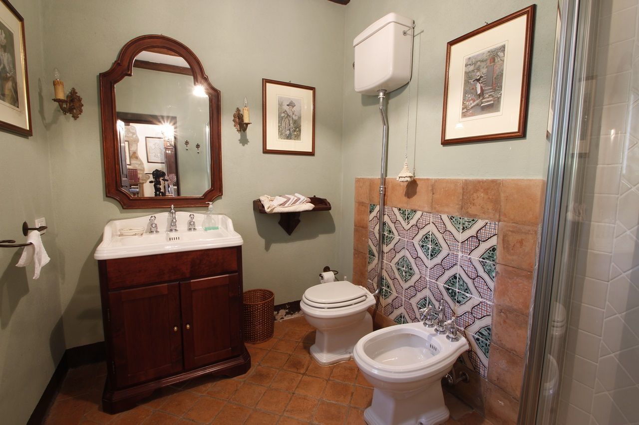 The interiors have been furnished with taste and elegance and they create the warm and inviting atmosphere typical of country manor houses, with large fireplaces in the living room and in dining room areas and bathrooms decorated with ancient tiles; the services include telephone/fax, an intercom system throughout the house and wireless Internet. Outside is a park whit fruit and olive trees and a garden created with great passion by the owner, full of flowers, ornamental plants and Mediterranean essences, with 3 lawns that will let you eat and relax outdoors while enjoying the enchanting panorama and an equipped pergola with a dining table that seats 20-30 people. Next to the large panoramic pool (14x7m) is a gazebo equipped with armchairs, sofas and tables with a splendid 360° view, a changing room with shower (in and outdoor) and an outdoor kitchen with barbecue. The caretakers live in a separated cottage inside the property. They tend to the daily cleaning of the house (and on request also cooking service) as well as tending to the garden and the swimming pool.
