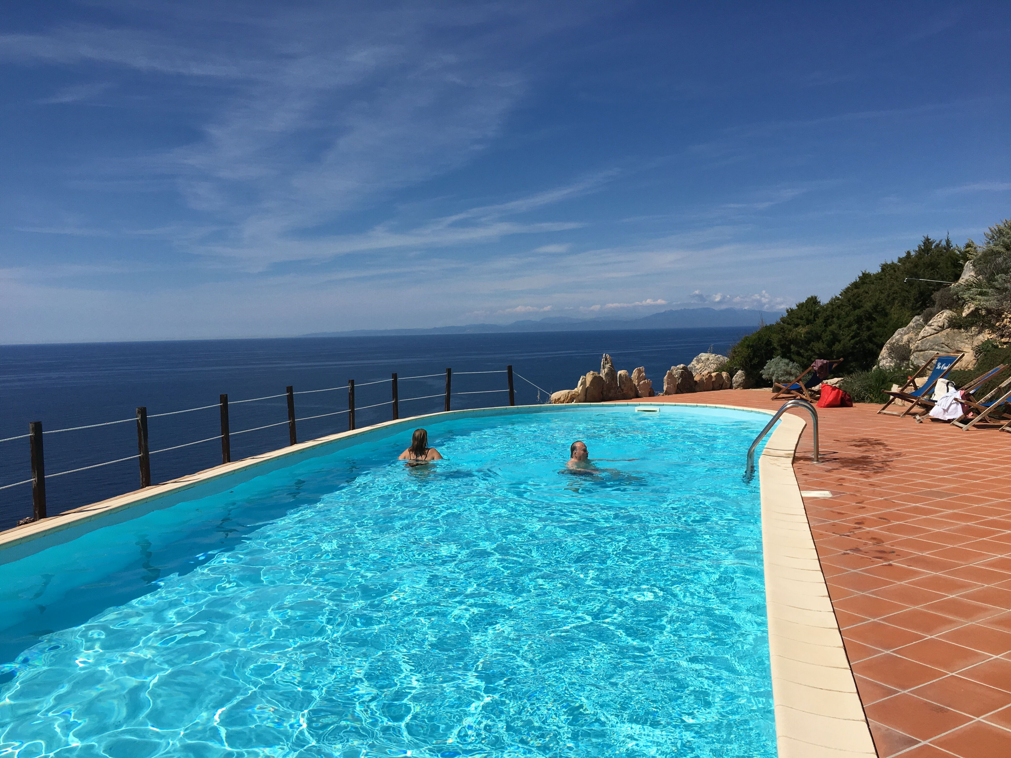 The communal pool with sun terrace overlooking the sea is equipped with deck chairs.
