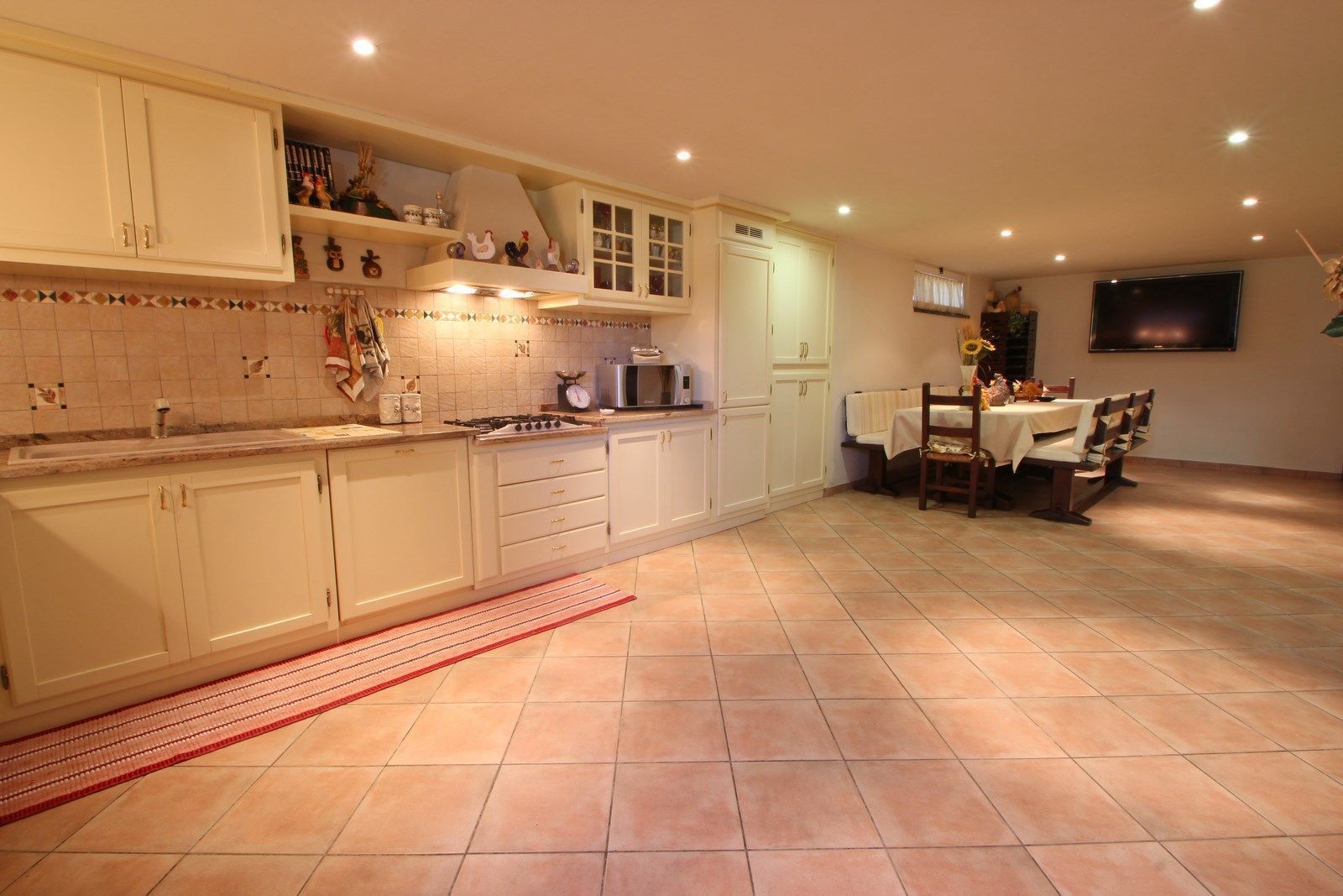 Large kitchen with all the necessary tools such as dishwasher, microwave, oven, toaster, coffee maker and fridge/freezer. On the other side of the kitchen (open space) is a large table for up to 16 persons and a large TV on the wall with satellite connection.